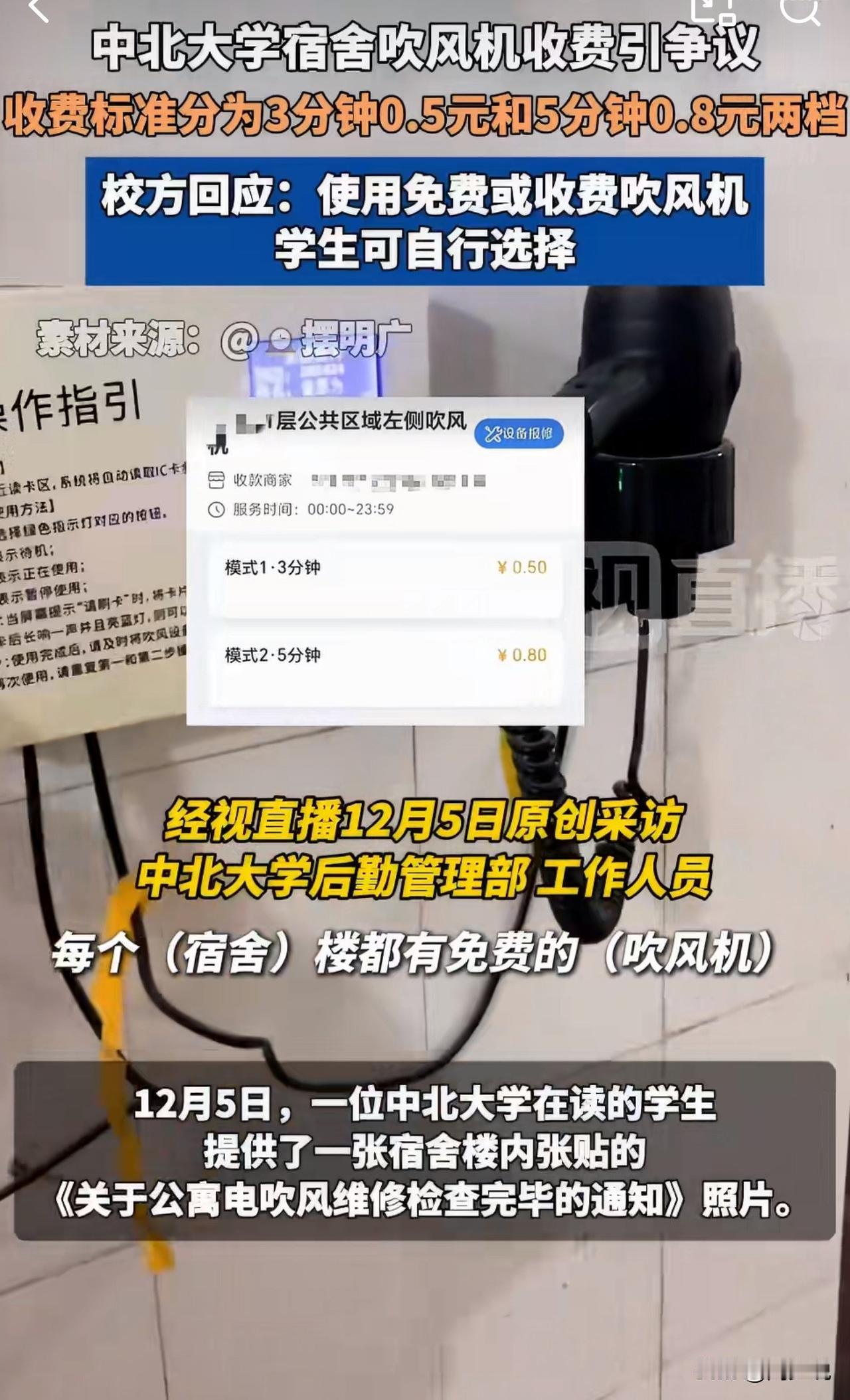 #MCN双量进阶计划#“中北大学宿舍竟然增设收费吹风机!”近日,该校学生发帖反映宿舍吹风机变收费,0.5元用3分钟、0.8元用5分钟,引发众多网友热议。 有网友说,“免费收费并存挺合理,兼顾不同需求,安全也有保障”! 也有网友认为,“收费标准不算贵,关键免费款得真能用、够方便”! 更还有网友表示,“只要免费款不缺位,多一种选择也挺好”。 那么真实情况是怎么样的呢? 据悉,学校此前免费吹风机使用已久,故障多且有安全隐患,已回收维修更换,目前每栋宿舍楼均配有免费吹风机,同时新增收费款满足个性化需求,女生宿舍投放数量更多。 校方表示,两种吹风机供学生自由选择,投放量会灵活调整。 周少认为,学校兼顾设备安全与学生需求的初衷可行,免费与收费并行能适配不同情况。核心是保障免费吹风机正常可用、数量充足,不变相强制消费。 客观的说,周少认为这种灵活调整若能落地到位,既解决旧设备隐患,又尊重学生选择,才是真正贴合学生需求的做法,也值得其他高校参考借鉴。 对于中北大学这种情况,大家怎么看呢?#长沙新朋友# #寻美三湘#