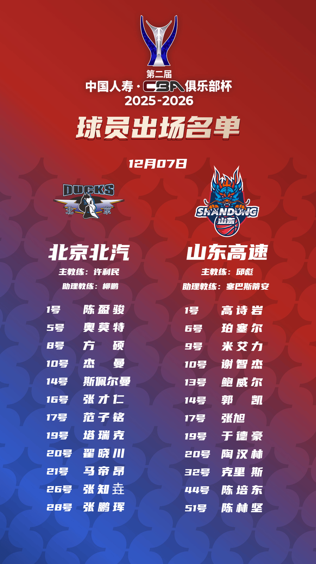 虎扑12月07日讯今日CBA俱乐部杯,北京vs山东大名单已经出炉。