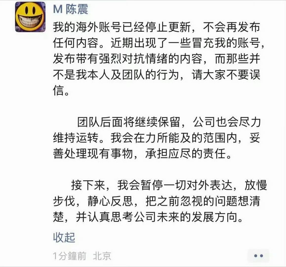 陈震海外账号涨粉挺快,昨天看还是8千,现在已经2.2万了。而且被封之后发的两条内容也已经删除了,并表示海外账号已经停止更新,不会再发任何内容,这你受得了吗?