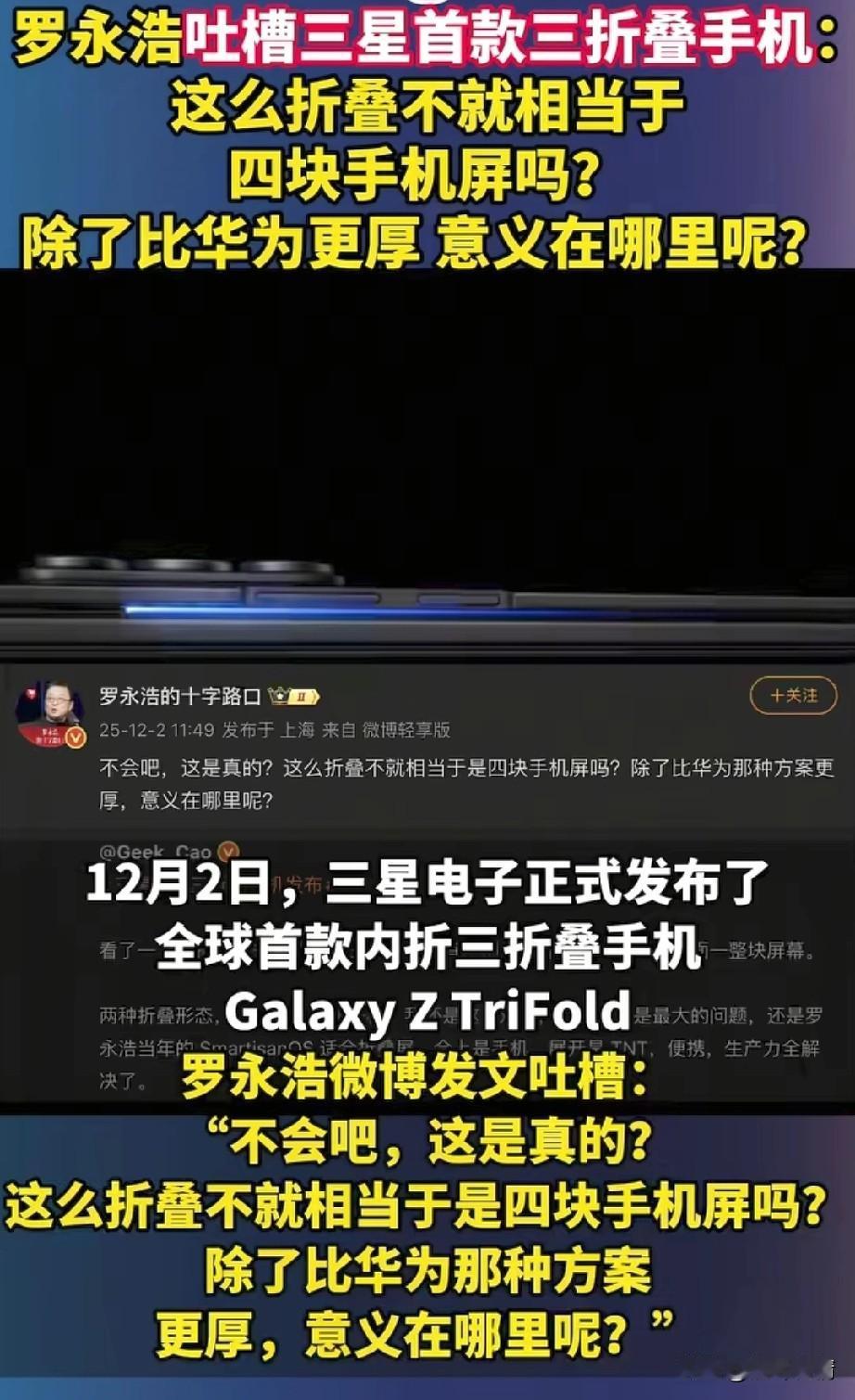 今日三星正式发布了全球首款内折3折叠手机,预测定价在2万起步, 计划年底在中国市场投放, 12月12号先在韩国上市, 随后便会在中国,新加坡等市场陆续上市,罗永浩看到三星发布的产品, 直接开启了吐槽模式, 直言这么折叠不就相当于四块手机屏幕吗?比华为更厚,意义在哪里? 大家都知道罗云浩的嘴, 那是真的毒, 本身罗永浩就是做手机出身, 对于手机他非常的了解, 他如此评价三星的折叠手机, 不得不说眼眶真的毒辣, 三星看来是要在中国市场折戟沉沙了, 大家对于罗永浩吐槽三星全球首款内折7三叠手机怎么看? 三星 为什么中国越来越少人用三星手机了 三折叠手机 三星折叠旗舰 折叠全面屏手机 三折叠屏手机 折叠三星