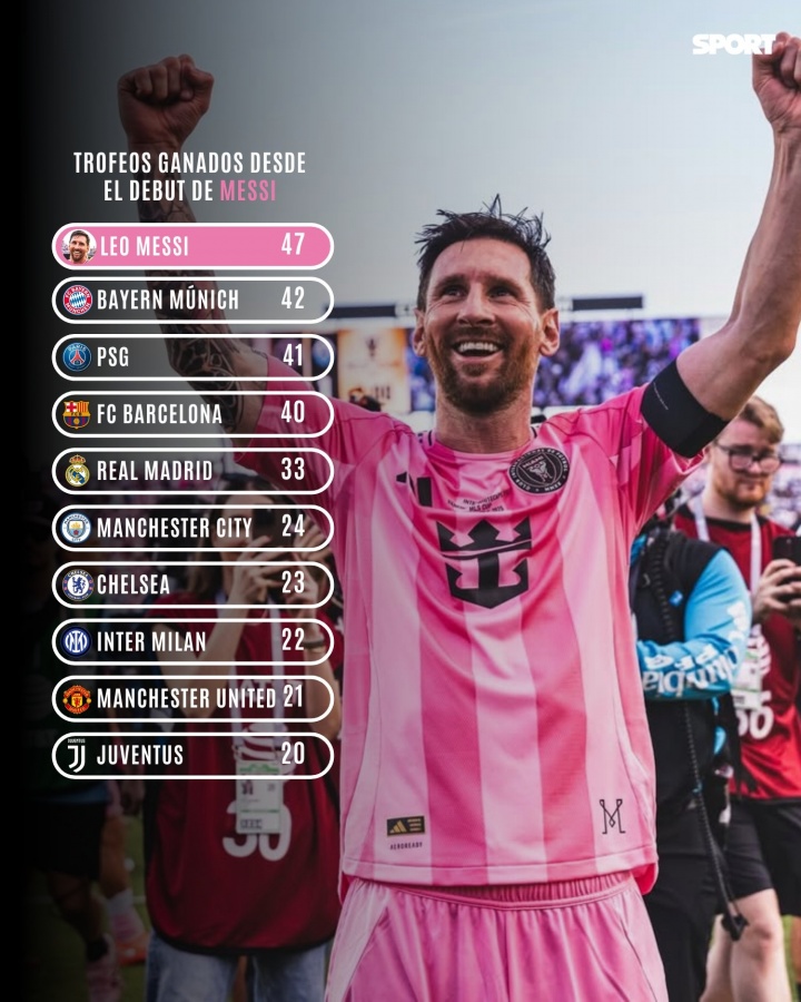 据每日体育报统计,梅西自首秀以来的奖杯数甚至超越了同期的一众欧洲豪门。