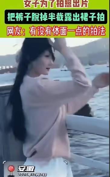 笑不活!安徽一女子为了拍照出片,竟然当众把裤子脱了,露出里面的短裙拍照,拍完之后,立马蹲下把裤子提起来,不是姐妹,你弯腰提裤子那一下,给我小脑整萎缩了,网友:有没有体面一点的拍法? ​​​“不是姐妹为了出片也太拼了,尴尬到脚趾抠地!” 事情发生在安徽一处热门打卡地,当时现场人来人往,不少游客都在忙着拍照留念。这位女子和同行的朋友一起,看中了一处光线绝佳的角落,想要拍一组氛围感美照。 只见她先是四处张望了一下,似乎在确认周围的情况,随后毫不犹豫地走到打卡点中央,当着周围陌生人的面,抬手就往下脱裤子。 她穿的是一条宽松的长裤,脱起来动作麻利,很快就把裤子褪到了膝盖处,露出了里面早已搭配好的短裙。短裙款式精致,和她上身的衣服相得益彰,看得出来是特意为拍照准备的穿搭。 脱完裤子后,女子丝毫没有在意周围投来的异样目光,立刻调整姿势,一会儿侧身转头,一会儿抬手撩发,对着朋友的手机镜头摆出各种造型,表情专注又投入,完全沉浸在自己的拍照世界里。 周围的游客被这突如其来的操作惊到了,有人下意识地别过脸去,有人忍不住小声议论,还有人拿出手机悄悄记录下这一幕。 有路过的小朋友好奇地问家长“那个阿姨在干嘛呀”,家长赶紧捂住孩子的眼睛,拉着孩子快步走开。而女子的朋友则全程举着手机拍摄,还时不时提醒她调整角度,似乎觉得这样的拍照方式再正常不过。 大概拍了两三分钟,女子觉得满意了,这才收起姿势,快速蹲下身子,慌忙把褪到膝盖的裤子往上提。或许是太过着急,又或许是蹲姿不太方便,她提裤子的动作显得有些笨拙,身体微微摇晃,还差点没站稳,那略显狼狈的模样,和刚才拍照时的精致形成了鲜明对比。 正是这个弯腰提裤子的瞬间,被网友调侃“给小脑整萎缩了”,成为了整个视频里最具争议的画面。 这段视频被传到网上后,迅速引发了全网热议,短短时间内就收获了数百万的播放量。网友们的评论五花八门,有人直言“为了出片也太拼了,完全不顾及公共场合的体面”, 也有人调侃“理解想拍美照的心情,但这操作属实没必要,尴尬指数拉满”,还有人灵魂发问“有没有体面一点的拍法?难道好看比教养还重要吗”。 随着社交媒体的发展,拍照打卡已经成为很多人出行的必备环节,想要拍出好看的照片分享生活,本身是一件无可厚非的事情。 但好看的照片固然重要,公共场合的文明礼仪更不能忽视。公共场所是大家共同的空间,每个人都有责任维护公共秩序和文明氛围,不能因为自己的一己之私,就做出影响他人、违背公序良俗的行为。 安徽这位女子的“出片操作”,虽然让她的照片有了话题度,但也让她陷入了舆论争议。毕竟,真正的美不仅在于照片里的造型,更在于日常生活中的文明举止。 在公共场合遵守礼仪,尊重他人的感受,这样拍出的照片才会更有温度,也更能得到大家的认可。 对此,你们有什么看法,欢迎评论留言~