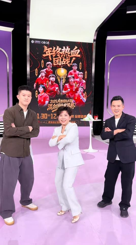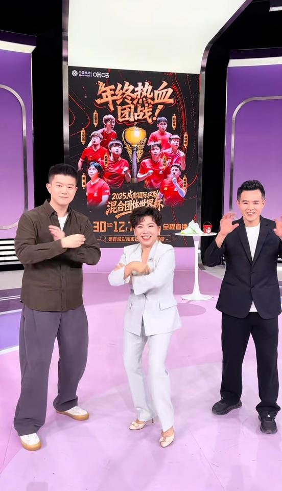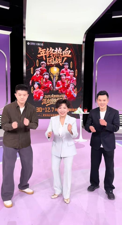 12月7日,邓亚萍老师在解说前又热舞了一下,她对生活越来越热爱了,看起来总是那么积极乐观。 邓亚萍老师穿着白色西装,白色高跟鞋,头发烫染过,很会打扮。决赛的直播共3个人,除了周老师,邓亚萍老师还邀请了刘国正。 邓亚萍站在中间,带着周老师和刘国政一起对着镜头舞动了身体,开心的热身后正式进入直播阶段。