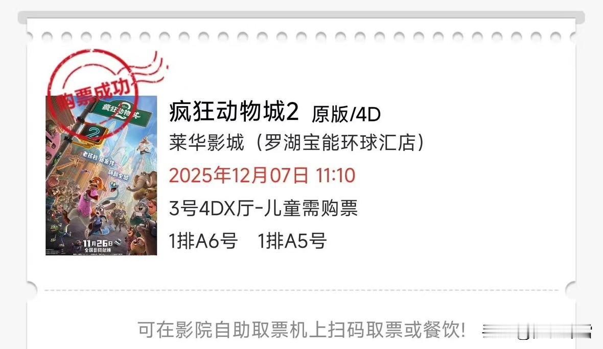 某鱼上买电影票,比一般的网络售票每张便宜十块。 姐弟俩今天去看了最近火热4D电影《疯狂动物城2》。两张4 D电影票119.8元,真便宜! 坐标:笋岗宝能环球汇城——莱华影城,广场、影城各处设置了很多动画场景,方便年轻人打卡拍照。4D观影的体验非常不错:起烟了,带出一股焦糊味.... 追捕犯人时,雪地里生死时速,还伴有雪花飘飘…… 据悉,《疯狂动物城2》迎来创纪录的开局,成为2025年全球首映表现最佳的电影,拿下动画电影史上最高的全球开画成绩,位列所有电影类型全球首映票房榜第四...... 大表姐终究是大表姐。昨天惠州,今天深圳。11:10观影,下午1 6: 30的大巴回学校。游刃有余,丰富多彩,难怪弟弟总盼姐姐回……临走,还打包一杯奶茶叫弟带回给我……