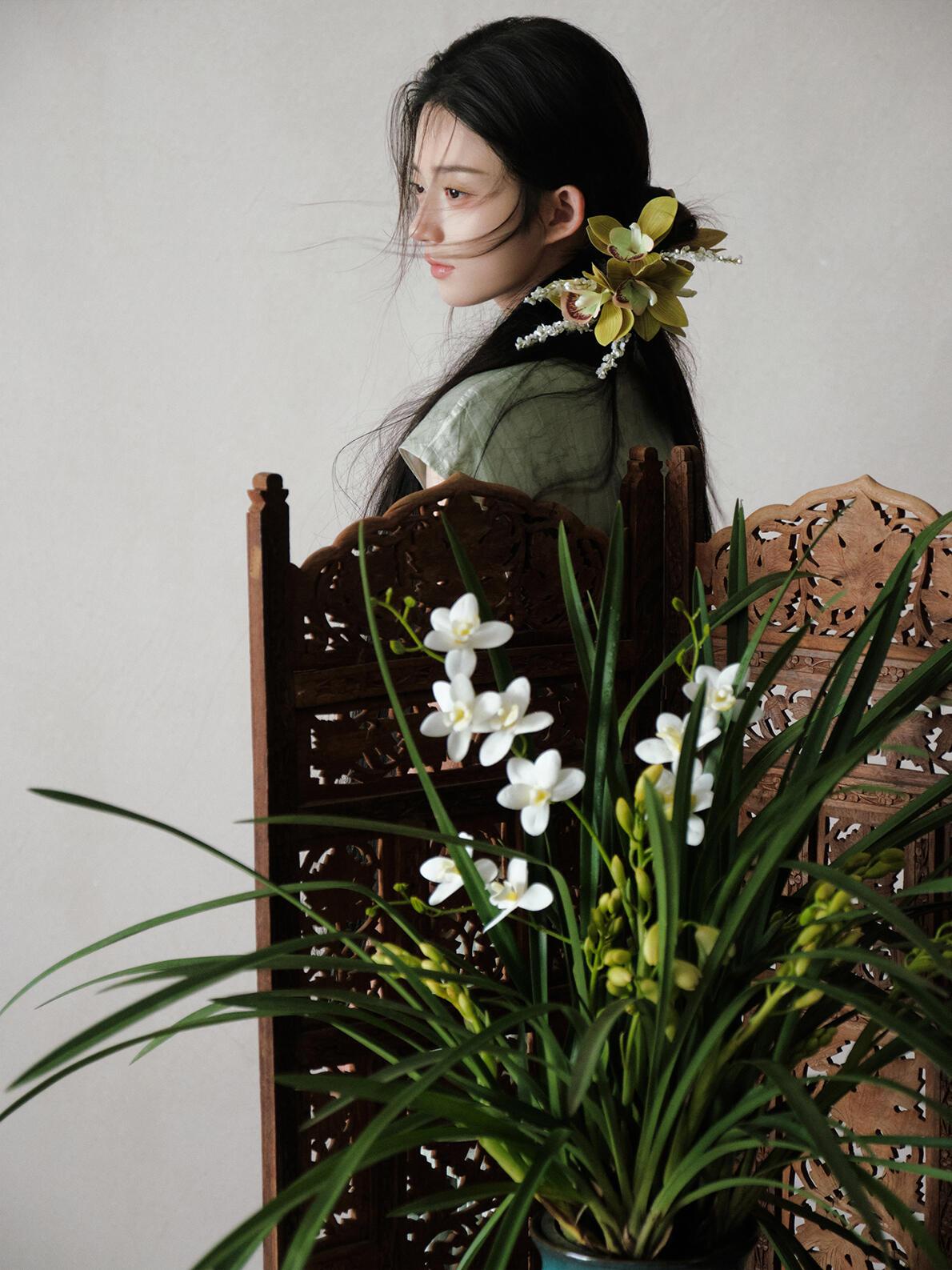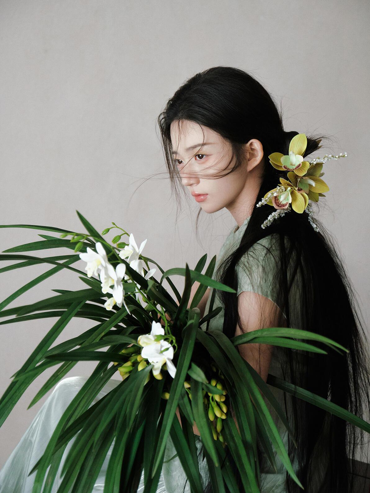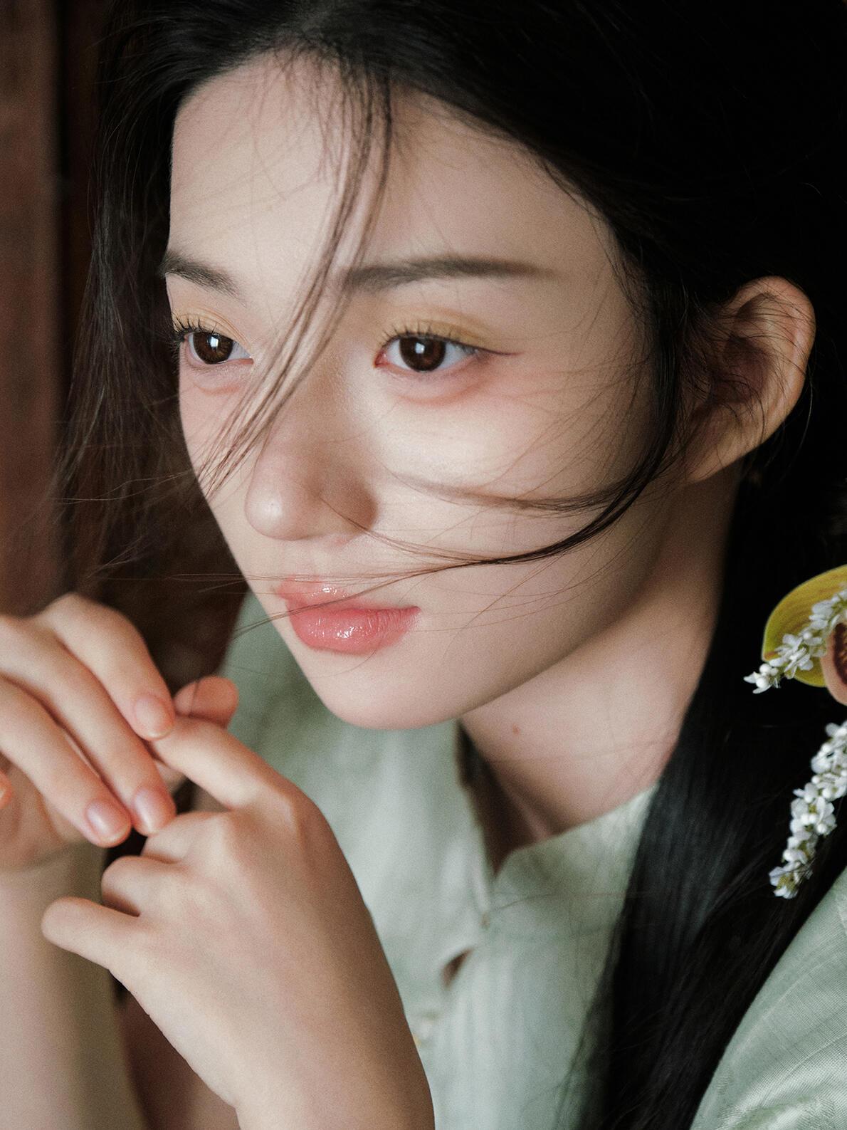 光影对“清雅”质感的塑造,像这组作品的处理,精准抓住了“柔而不寡”的度:漫射光均匀覆盖皮肤与织物,既保留了旗袍暗纹的肌理,又让兰花瓣的半透明质感自然晕开;侧光的微量介入,在脸颊与兰叶边缘勾勒出浅淡轮廓,避免了平光的单调。晒图笔记大赛 但局部光影的控制仍有提升空间:例如特写镜头中,发丝遮挡的眼部区域暗部细节略有缺失,削弱了眼神的情绪传递;兰草叶片的光影层次不足,部分叶片因曝光均匀而显得“扁平”。若在补光时增加弱光位的细节提亮,能让“清雅”的质感更具层次。