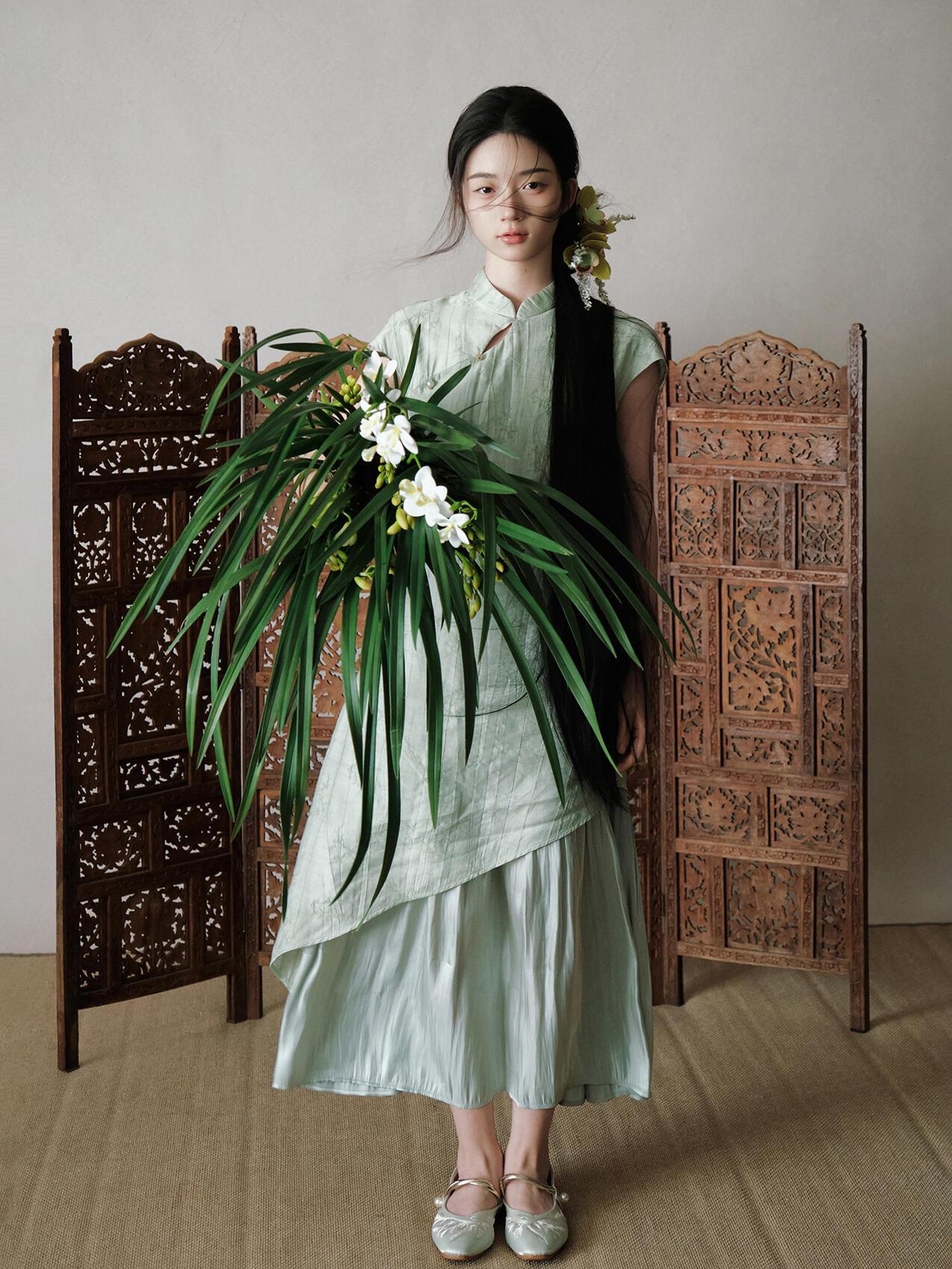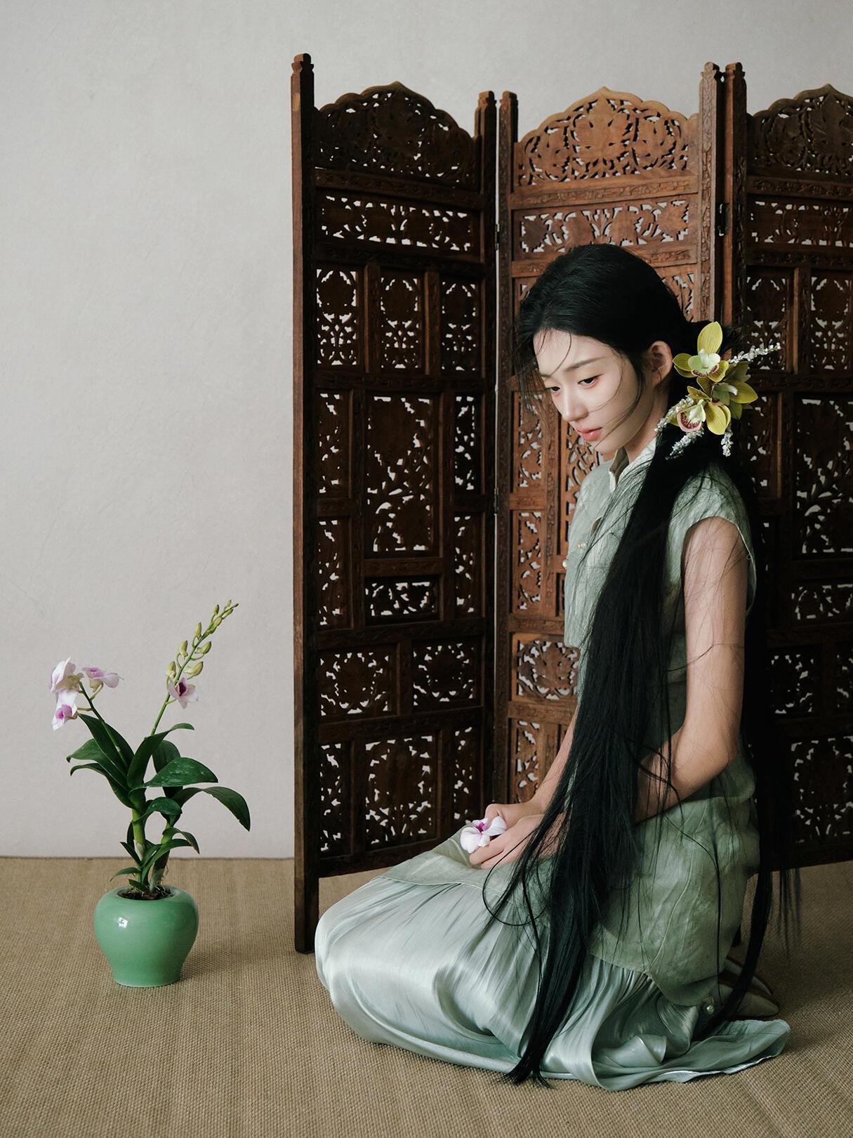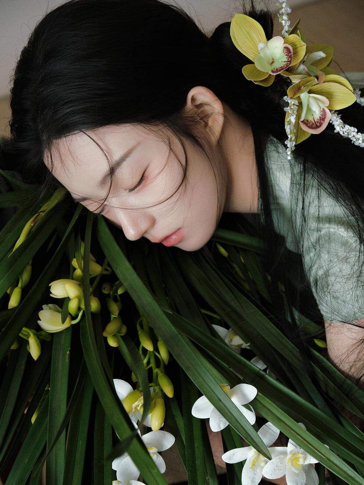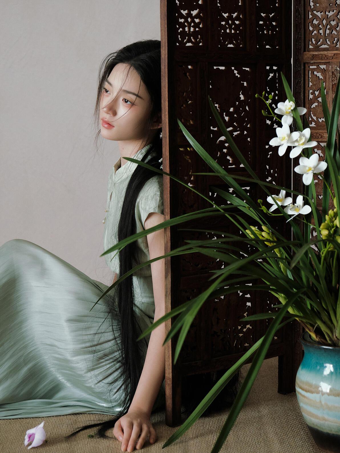 光影对“清雅”质感的塑造,像这组作品的处理,精准抓住了“柔而不寡”的度:漫射光均匀覆盖皮肤与织物,既保留了旗袍暗纹的肌理,又让兰花瓣的半透明质感自然晕开;侧光的微量介入,在脸颊与兰叶边缘勾勒出浅淡轮廓,避免了平光的单调。晒图笔记大赛 但局部光影的控制仍有提升空间:例如特写镜头中,发丝遮挡的眼部区域暗部细节略有缺失,削弱了眼神的情绪传递;兰草叶片的光影层次不足,部分叶片因曝光均匀而显得“扁平”。若在补光时增加弱光位的细节提亮,能让“清雅”的质感更具层次。