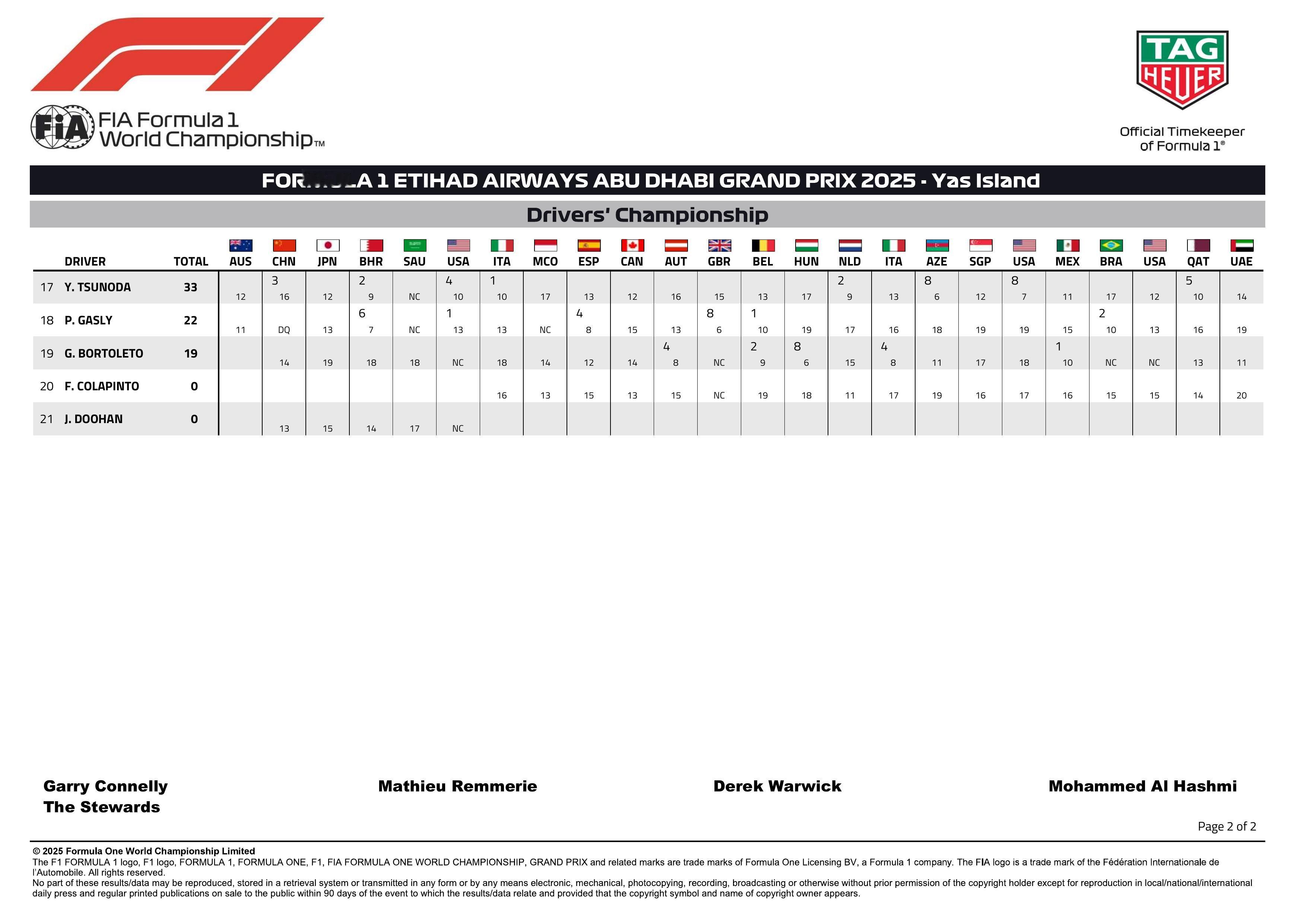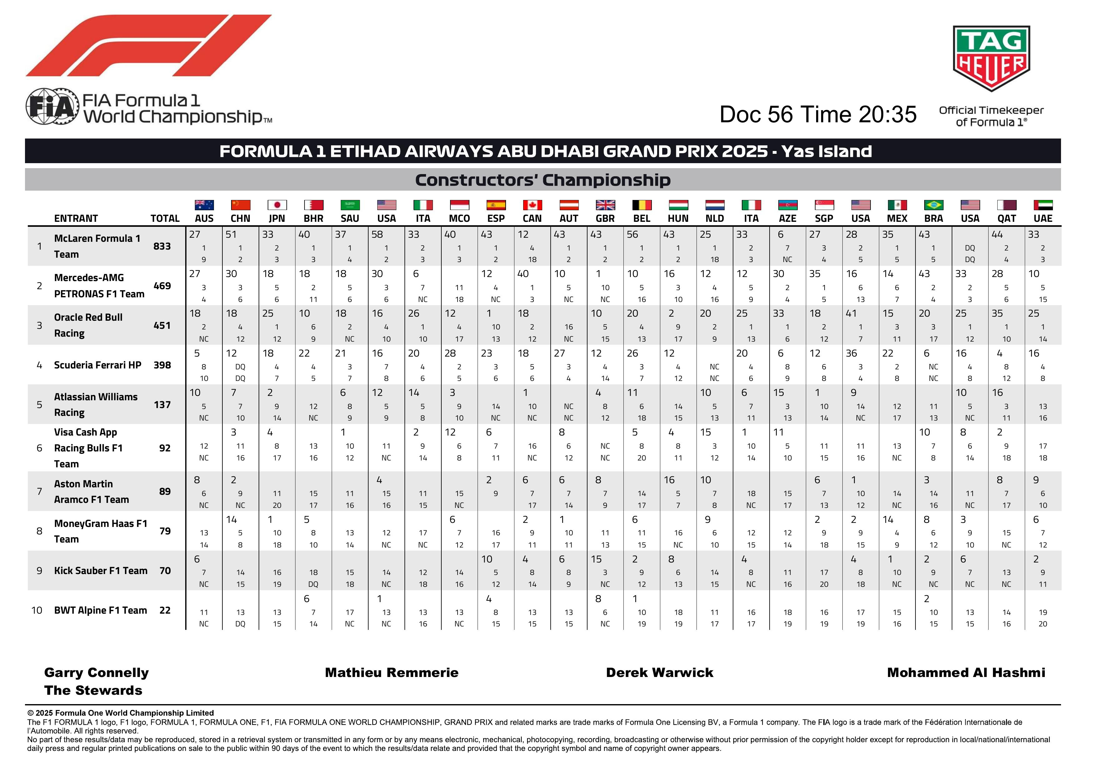 2025赛季F1世界锦标赛最终版车手和车队积分榜F12025F1阿布扎比大奖赛