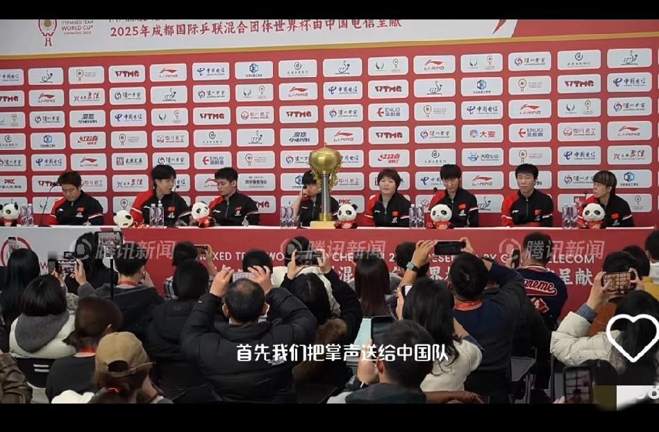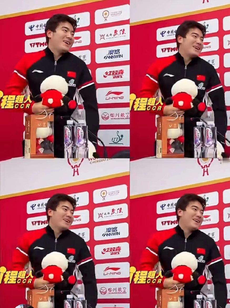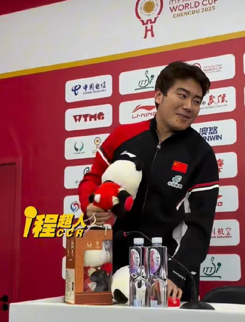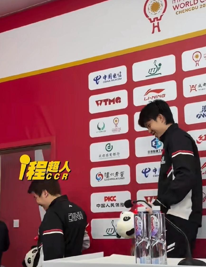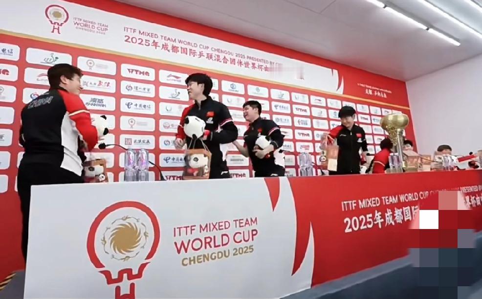 昨晚成都混团发布会, 大家都挑边上的位置坐, 没办法了莎莎坐在中间了。 坐下后每个人面前都摆了一个小熊猫, 只有梁靖昆面前是两个, 等发布会快结束时候, 工作人员又进来每人发了一个, 这样看梁靖昆就是三个吉祥物。 王楚钦大概是说梁靖昆的多了, 梁甜甜说:我们家人多。 哈哈,网友调侃说:确实是比楚钦家人多,把周雨家女儿也算上了, 因为人家也叫他“爸爸”了。