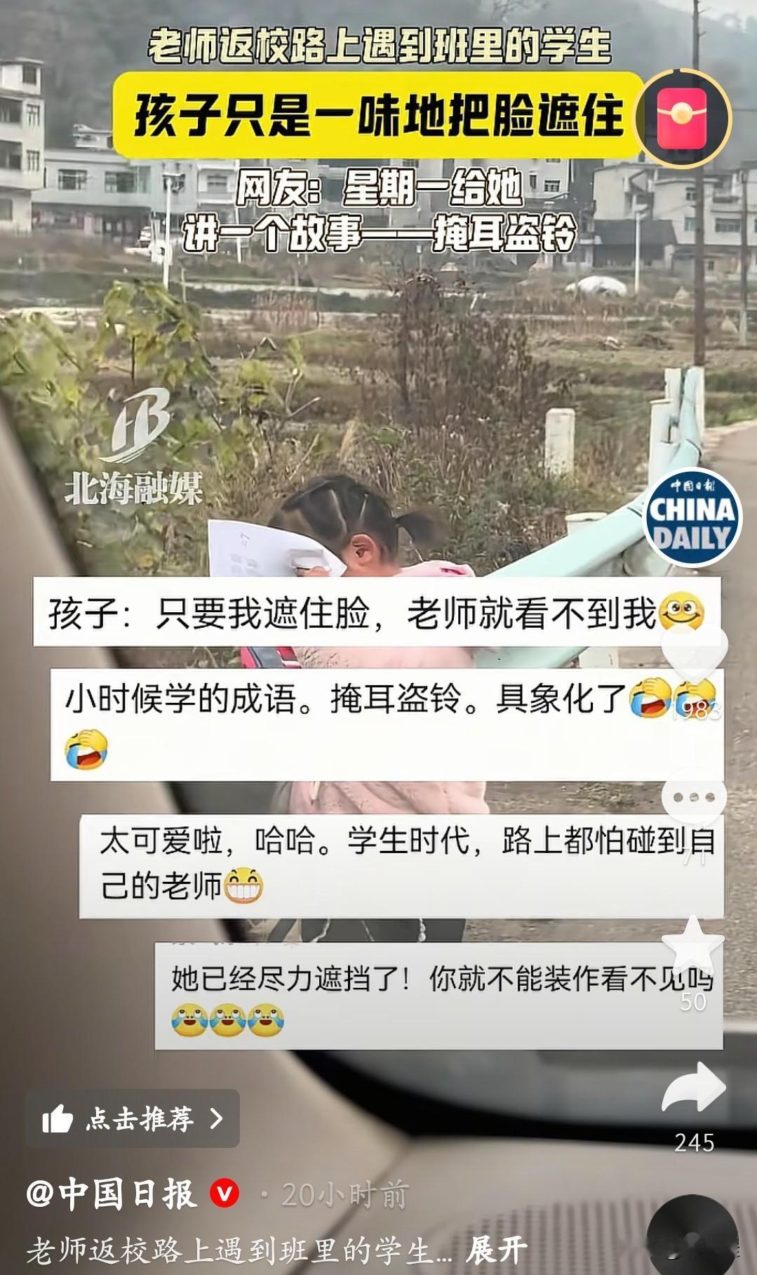 上了“人民日报”的小女孩,别遮了,全网都知道你遇到老师了!用试卷挡住脸,主打一个“看不见我,看不见我”! 现实版的“掩耳盗铃”,只用试卷挡住脸,太低估老师的眼力了,又怂又萌的样子,像极了小时候躲老师的我们! 如果此时,老师停车,摇下车窗,叫她的名字,她会不会更加佩服老师,然后更加努力学习呢?