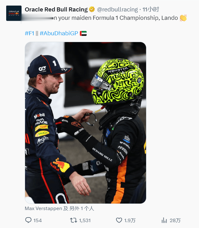 虎扑12月08日讯在F1阿布扎比收官战,迈凯伦的兰多-诺里斯最终拿到季军,锁定总冠军。红牛车队向这位英国车手送上了祝贺。