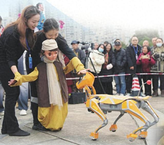 12月4日,第四届南充国际木偶艺术周街头巡演现场,机器狗与木偶互动。余中华摄(C视觉)