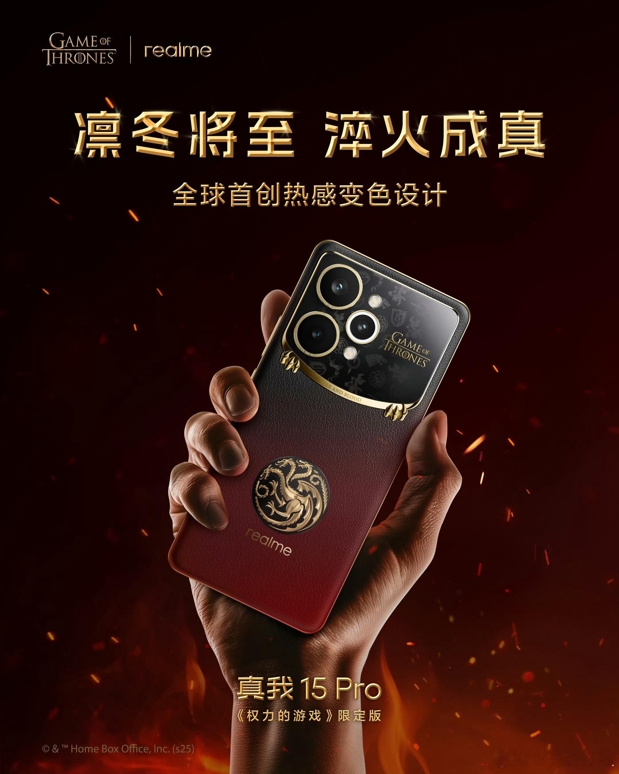 真我15Pro权力的游戏限定版真我15 Pro《权力的游戏》限定版,帅不帅,而且首创了热感变色设计,随着温度变化颜色