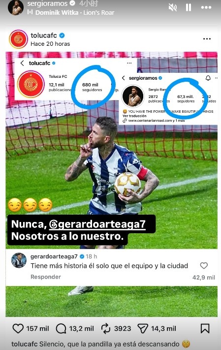 对此,拉莫斯将自己和托卢卡的社媒粉丝数做了对比,暗示尽管球队可能输了比赛,但他个人的历史地位和影响力远超对手。拉莫斯拥有6734万ins粉丝,而托卢卡只有68万。