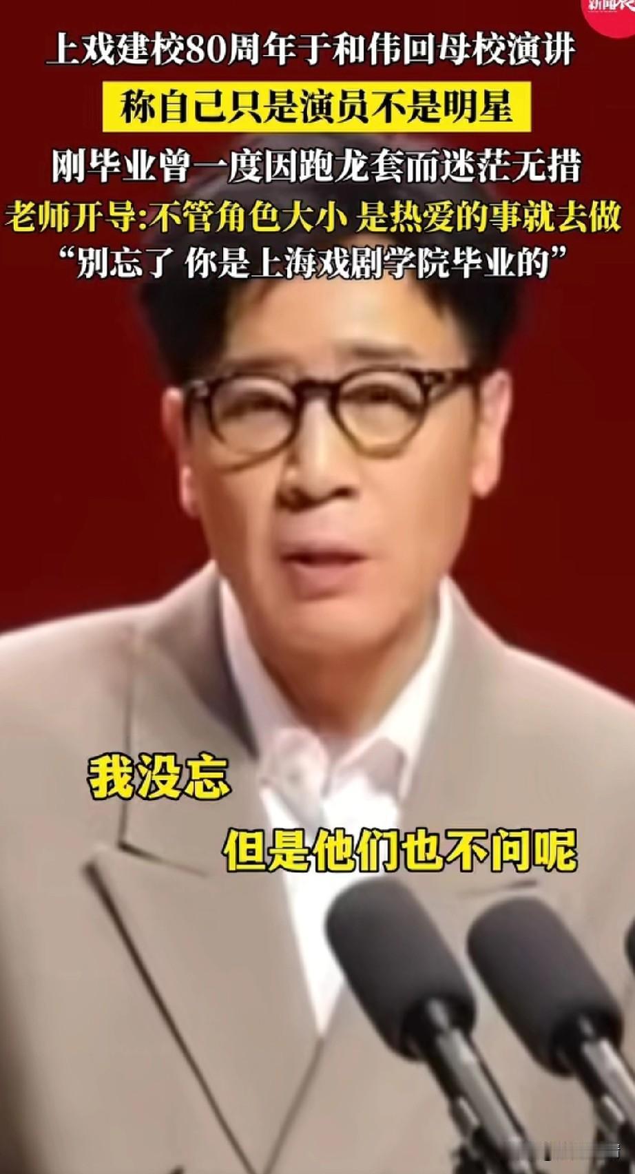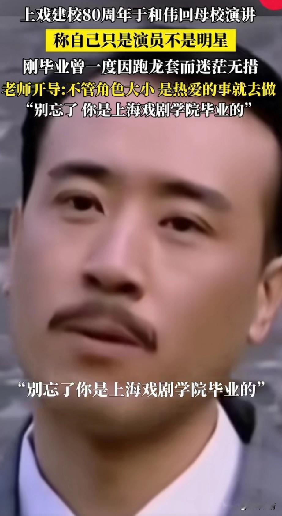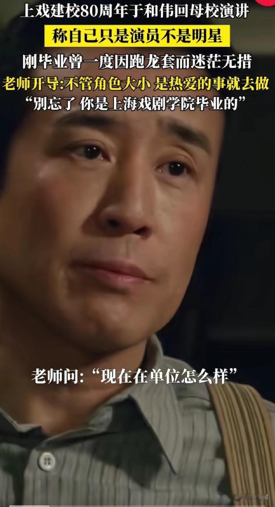 于和伟在上戏80周年的校庆上发表讲话,逗乐了在场的所有人, 他表示我不是明星, 只是一个普通的演员, 讲述了自己回到上戏被老师询问, 你现在是哪个单位的? 于和伟当时尴尬极了, 解释自己只是个跑龙套, 上戏的老师表示, 你不要忘记你是上戏毕业的, 千万不能给上戏丢脸, 于和伟表示关键跑龙套的时候, 也没有人问我是上戏的, 他的这段讲话风趣而幽默, 既表达了自己对于上戏的调侃, 又表现了自己热爱演戏的初衷, 一个好演员就应该这样, 勇敢追求自己的演戏梦, 火不火是导演的事, 自己只要做好演员的职责, 那就不会给上戏丢脸! 人家对于于和伟这段上戏演讲怎么看? 于和伟 于和伟演技 于和伟经典台词 于和伟走红毯 南京导演于和伟 于和伟白玉兰