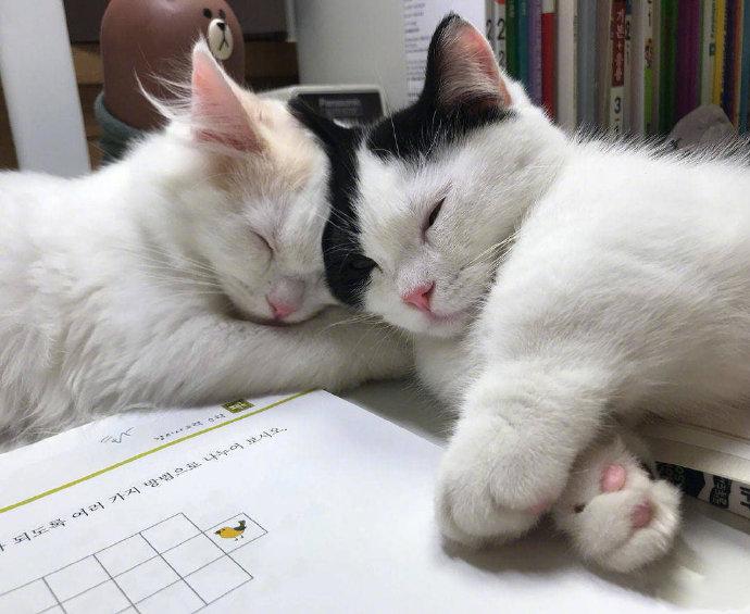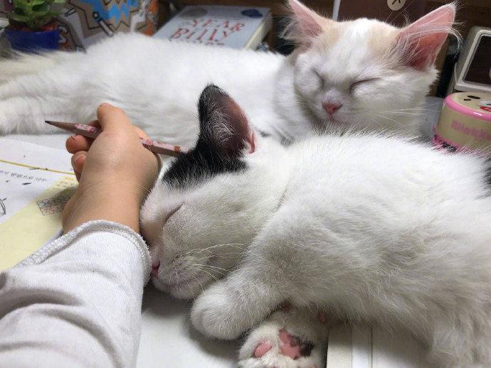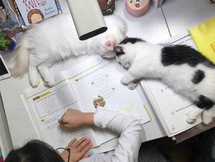 小主人认真在写作业,两只小猫在旁边上陪到睡着