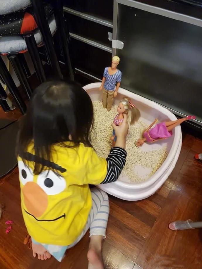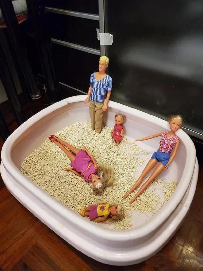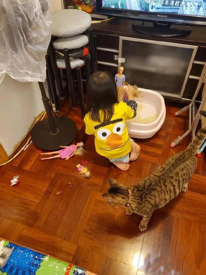 猫砂盆被小主人当作海滩了…猫猫心里一万个敲里马!