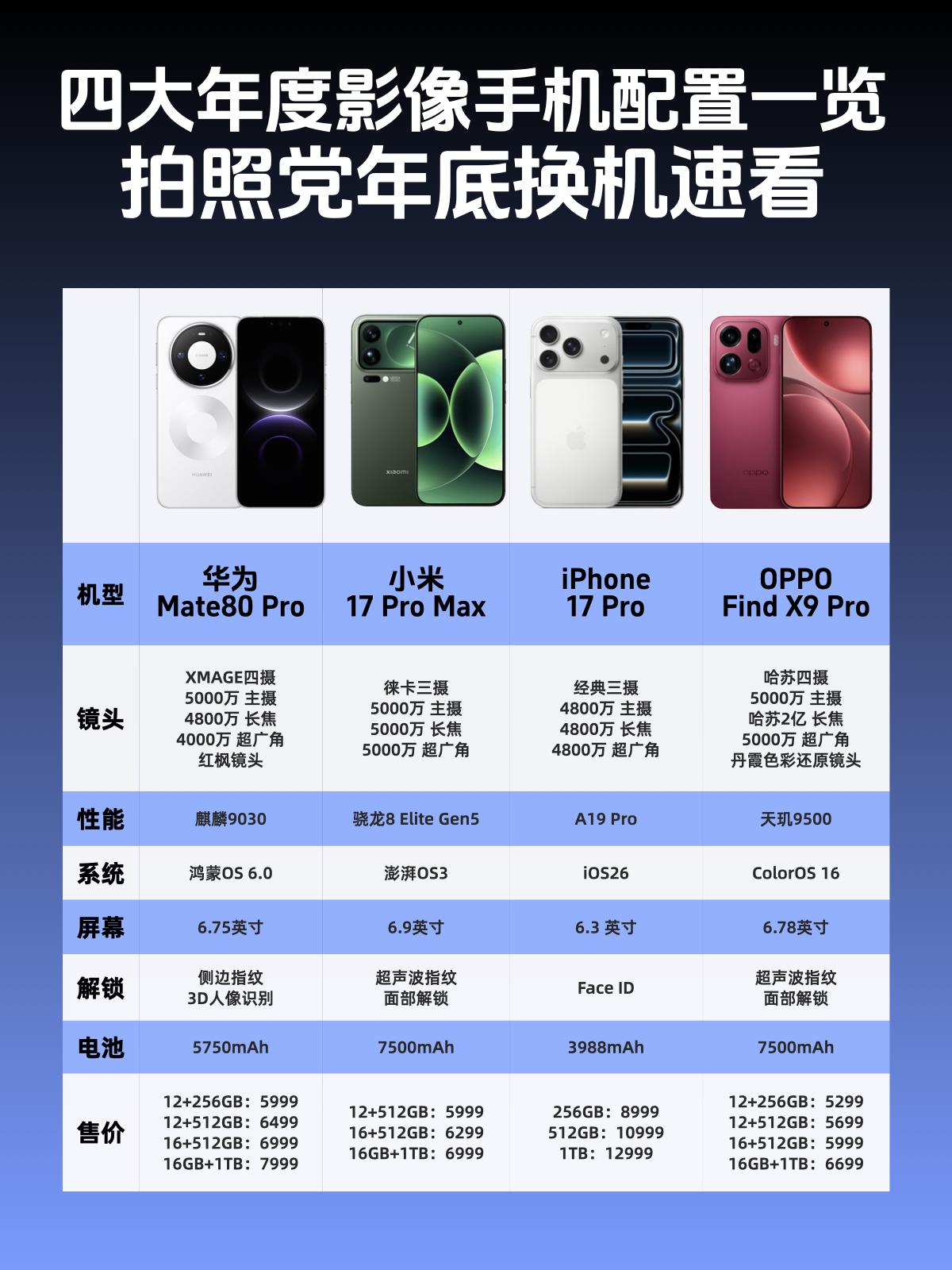 拍照发烧友年底想换机?别只考虑iPhone了 没辙了,想换手机不知道咋选了,主要是想要拍照好一点的,但看完这年度四大旗舰,感觉都挺不错的啊🔍懂行的都咋选? 华为Mate80 Pro拍照能力很在线,四摄配置还带🍁红枫色彩镜头,拍照色彩更真实。而且今年华为还回归了星环设计,外观就很吸引人啊,鸿蒙6系统生态也很权威,5999起感觉也很合适。 小米17 Pro Max也挺强的,徕卡三摄风格很对味,拍人文很有感觉。🔥性能这块骁龙芯片也比较行,澎湃系统今年提升也很大,各方面体验都很到位,5999起也挺香的。 iPhone 17 Pro就很稳,主要是录像这一块苹果太权威了,再加上苹果🍎今年外观大改,牙膏挤爆,iOS26焕新,8999起只要预算到位,入手都没毛病的。 OPPO Find X9 Pro的哈苏四摄是拉满的,跟华为一样有色彩镜头🔭哈苏2亿潜望+丹霞色彩还原镜头随便拍都很出片,领先其它没有色彩镜头的旗舰一步。而且ColorOS 16也是安卓流畅代表了,配上7500mAh大电池,属于是流畅好用还耐用,主打一手没短板,5299性价比很高。 要是让你选,你会选择哪款呢?