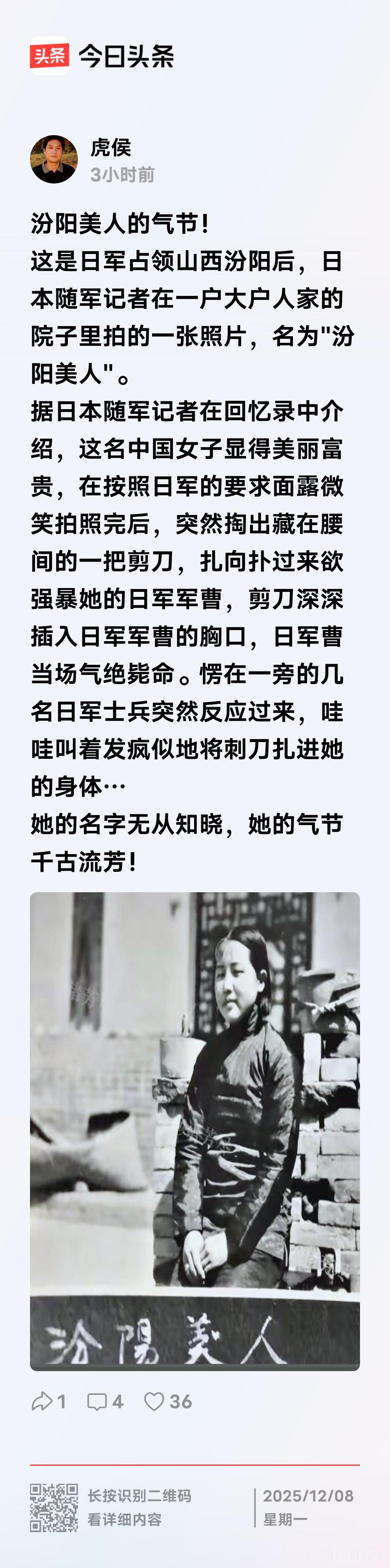 照片中的这个漂亮女子,是非常刚烈的,据说在日本鬼子为她拍摄完这张照片之后,她就和日本鬼子同归于尽了,也不知道这个故事是真的还是假的,但是以日本鬼子的残忍和邪恶,这样的事情它们是绝对干的出来的,而且在它们侵略我们的时候,类似于这样的丧尽天良的事情,它们干的实在太多了,罄竹难书,全是血泪,作为华夏儿女,永远都不要忘记日本鬼子在我们这里犯下的滔天罪行,永远都要铭记这段历史,让我们的子孙后代了解我们曾经遭受的苦难!