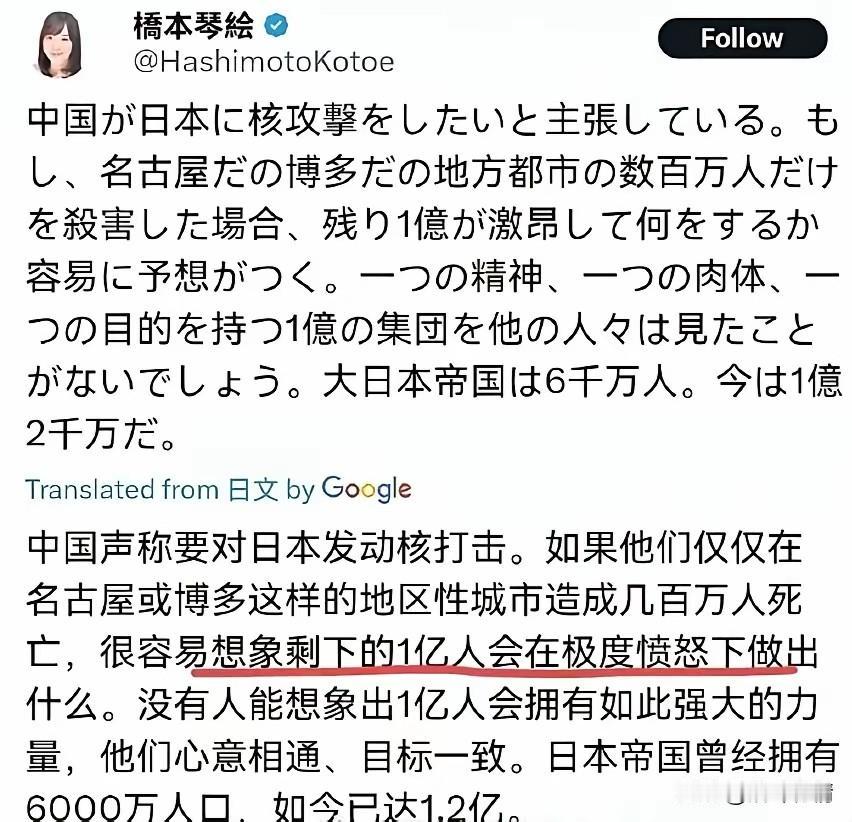 日本这位女作家桥本琴绘, 是高氏早苗狂热粉丝, 思想上极度右翼, 公然叫嚣如果中国对日本进行核打击, 造成百万人伤亡, 那么剩下的1亿人将会愤怒的为他们复仇,这话随口就说, 这可是一位女作家说的话, 这思想极度危险, 日本的文化分子也不容小觑, 她们都是右翼的支持者, 国内很多知识分子叫嚣中日友好, 没想到日本的知识分子, 根本不是这样想的, 她们的眼中只有欲望, 高市早苗就是代表, 日本这个民族是狼性文化, 对它讲仁义根本不行, 对付豺狼只有让它害怕才行, 大家对于这位日本女作家的言论怎么看? 高市早苗内阁 日本早亡 日本领导人早苗 日本右翼 日本新左翼