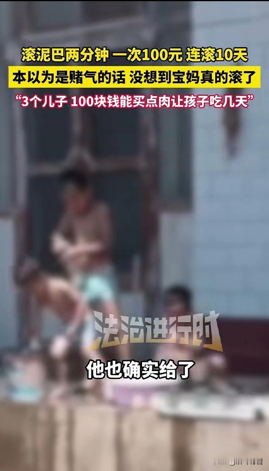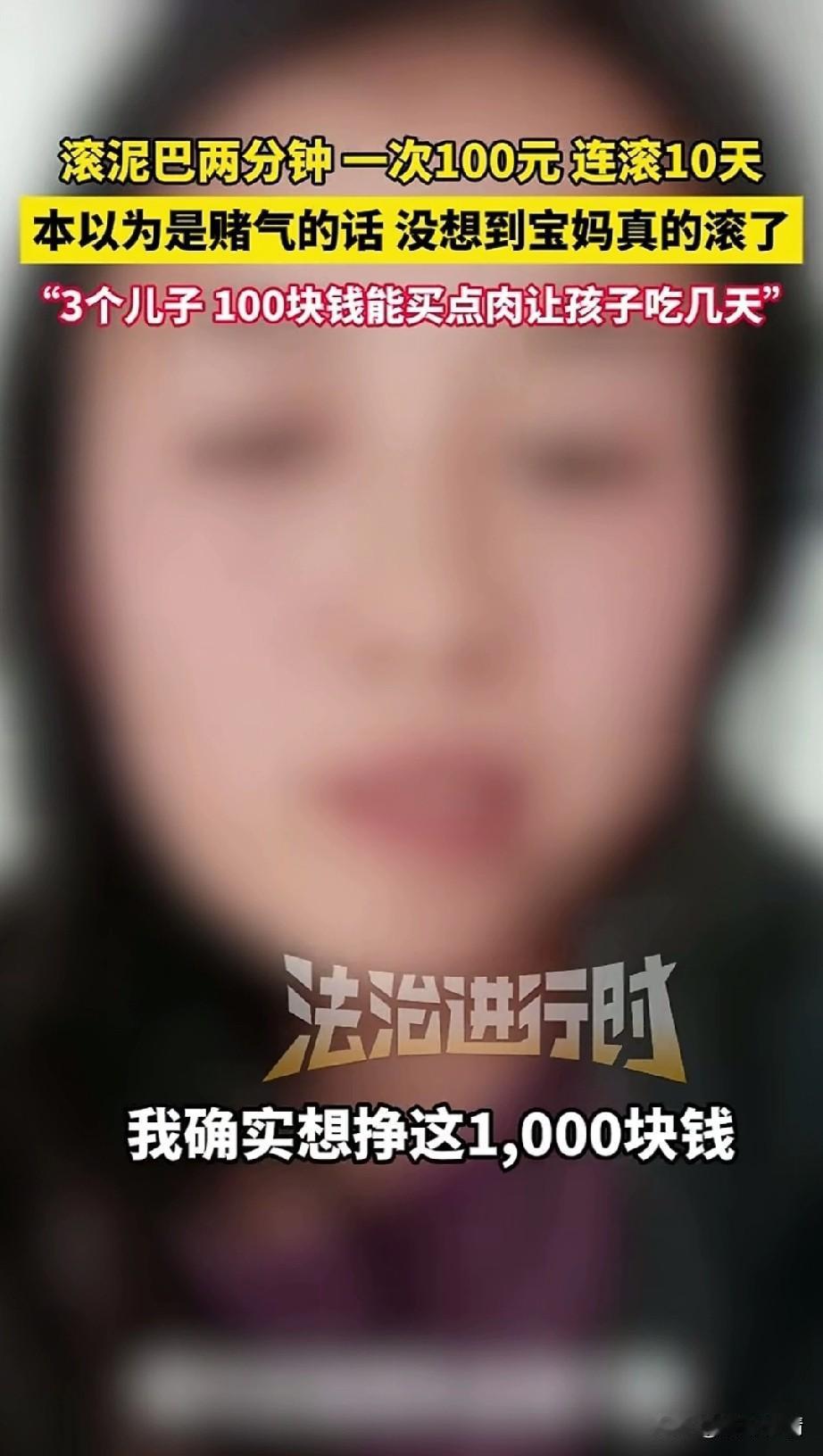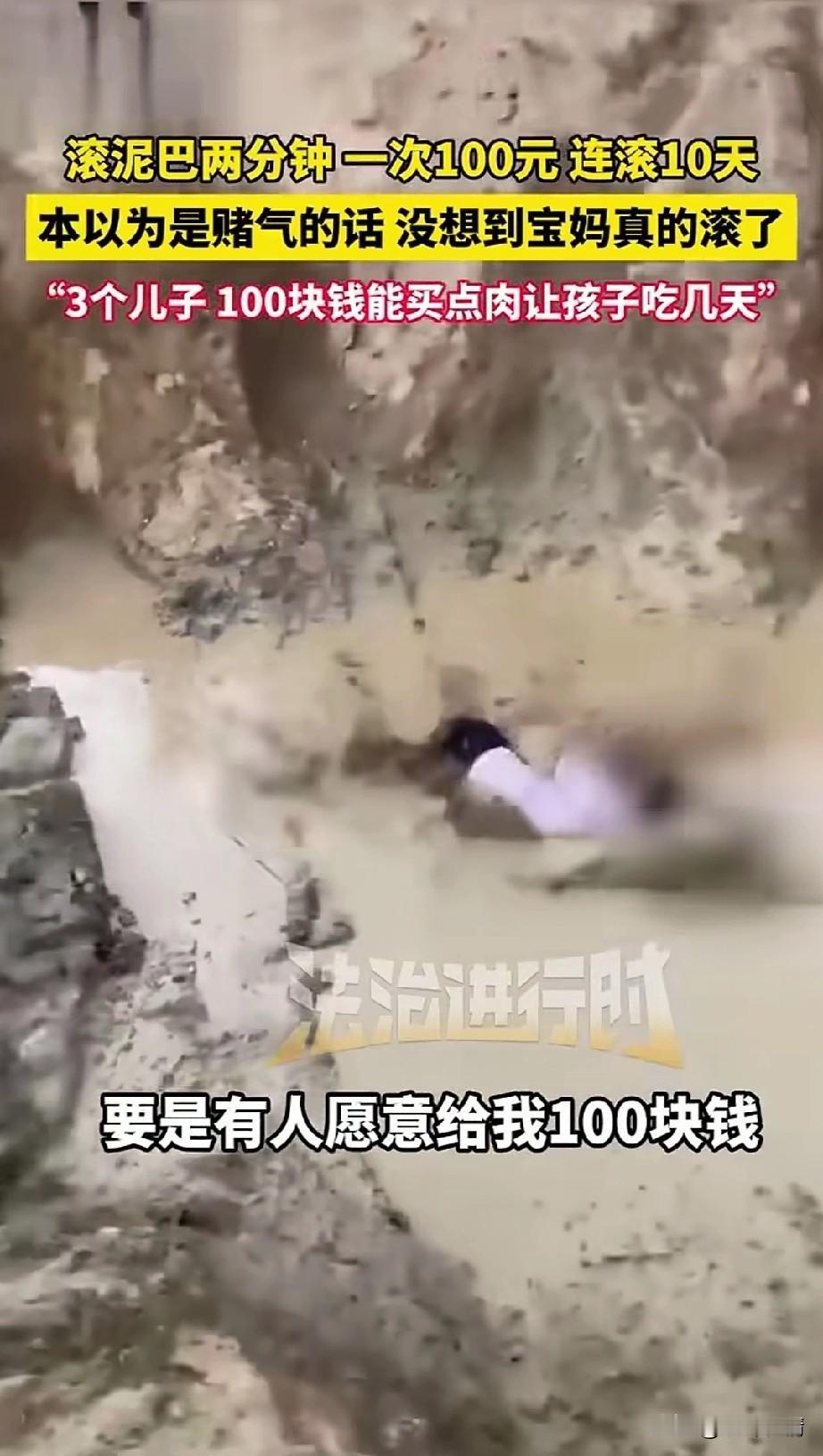 女子看到网上有人滚泥巴挣钱, 于是就在下面评论了自己也想挣这个钱,私信够对面居然同意了, 对面大哥表示出问题概不负责, 立字为据, 要求要像大叔那样不打折扣滚2分钟,视频要从一开始就录, 中间不能停顿, 女子全部答应下来, 本以为是赌气的话, 没想到宝妈真的滚泥巴了, 还让家人录了视频, 一次200元,10次1000元! 对面大哥也很守诚信, 最后真的把钱给了宝妈, 宝妈发视频表示感谢, 表示自己不怪对面大哥, 他也没有恶意, 是自己想挣这个钱, 宝妈介绍自己一胎生了个儿子, 二胎生了个双胞胎儿子, 想着100块钱可以让儿子吃几天肉, 还是很值得的, 母爱真的伟大, 为了孩子什么都可以做, 大家对于这位滚泥巴赚钱的宝妈怎么看? 母爱是自私的还是无私的? 论母爱的重要性 小孩儿玩儿泥巴 泥巴小萌娃 泥巴搞笑女