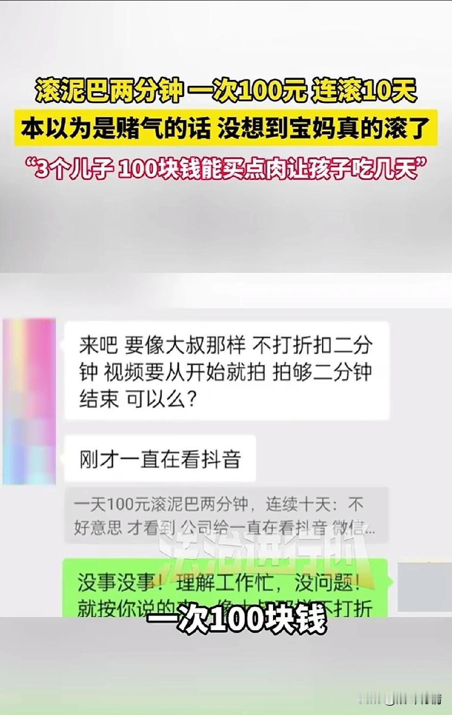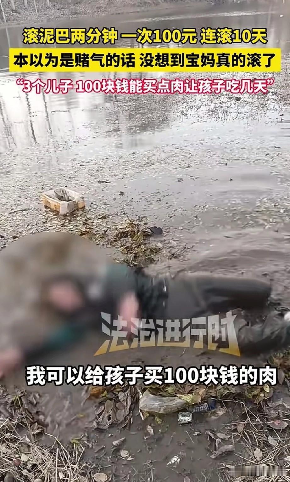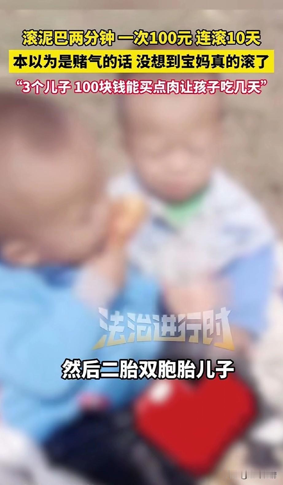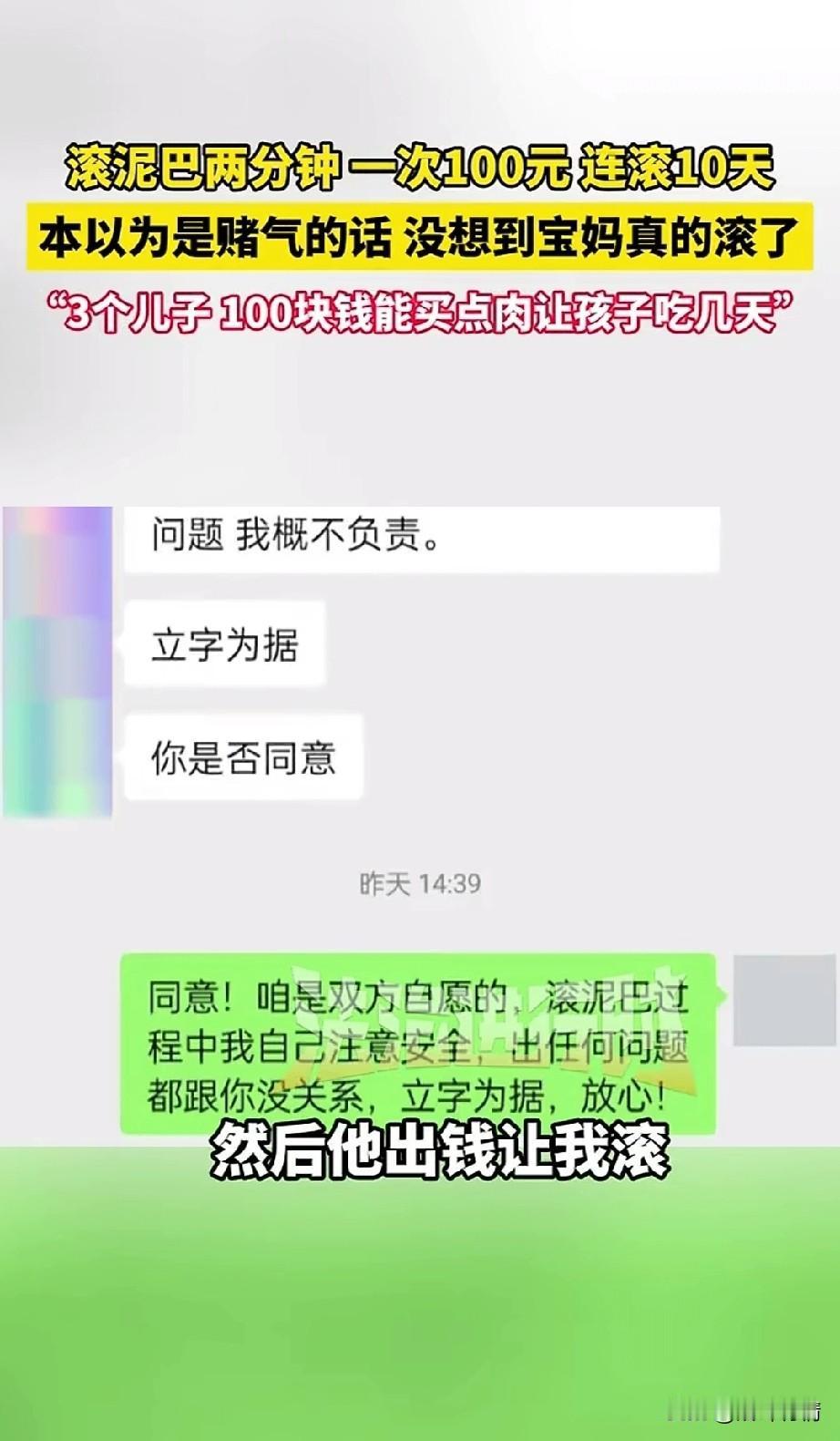 女子看到网上有人滚泥巴挣钱, 于是就在下面评论了自己也想挣这个钱,私信够对面居然同意了, 对面大哥表示出问题概不负责, 立字为据, 要求要像大叔那样不打折扣滚2分钟,视频要从一开始就录, 中间不能停顿, 女子全部答应下来, 本以为是赌气的话, 没想到宝妈真的滚泥巴了, 还让家人录了视频, 一次200元,10次1000元! 对面大哥也很守诚信, 最后真的把钱给了宝妈, 宝妈发视频表示感谢, 表示自己不怪对面大哥, 他也没有恶意, 是自己想挣这个钱, 宝妈介绍自己一胎生了个儿子, 二胎生了个双胞胎儿子, 想着100块钱可以让儿子吃几天肉, 还是很值得的, 母爱真的伟大, 为了孩子什么都可以做, 大家对于这位滚泥巴赚钱的宝妈怎么看? 母爱是自私的还是无私的? 论母爱的重要性 小孩儿玩儿泥巴 泥巴小萌娃 泥巴搞笑女