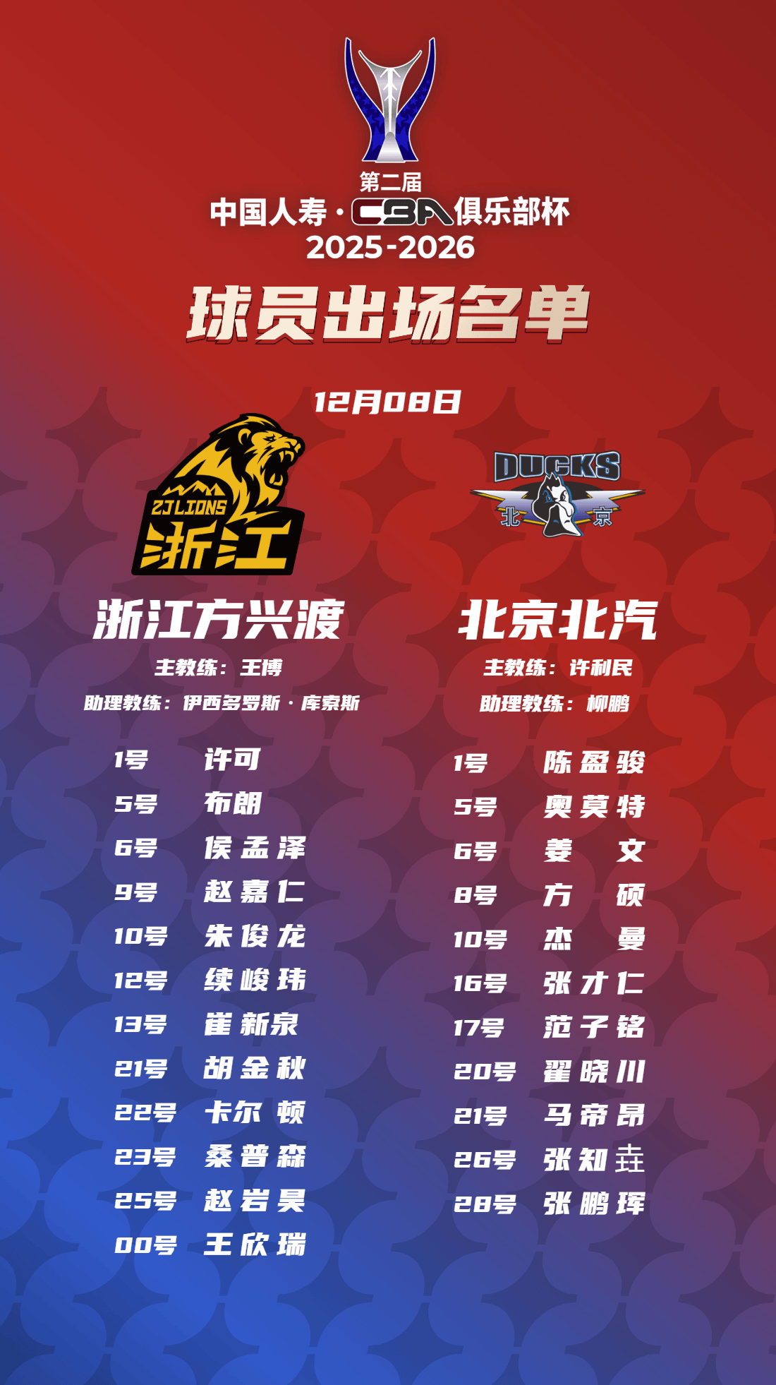 虎扑12月08日讯今日CBA俱乐部杯广厦vs北京赛前大名单已经出炉。