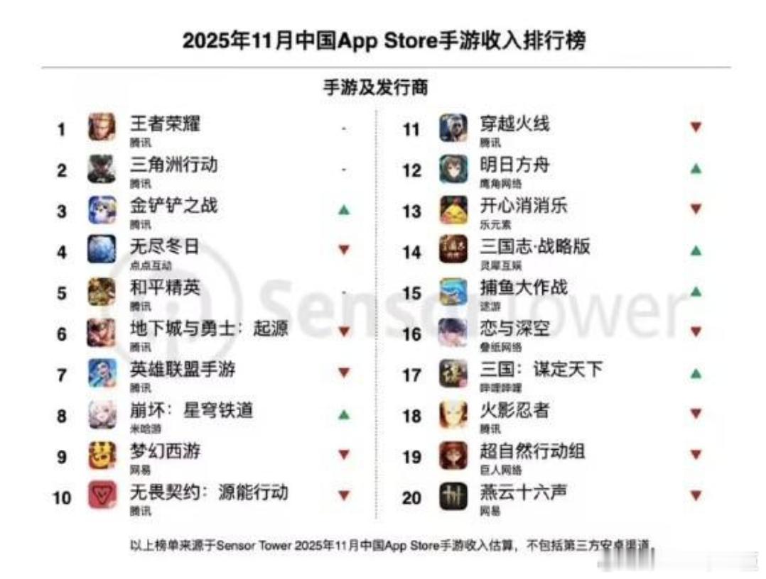 33个中国厂商入围手游收入榜前100Sensor Tower商店情报平台显示,2025年11月共33个中国厂商入围全球手游发行商收入榜TOP100,合计吸金19.5亿美元,占本期全球TOP100手游发行商收入35.8%。2025年11月,腾讯凭借头部产品的强势爆发力,稳居全球手游发行商收入冠军。凭借三端互通优势,《三角洲行动》持续领跑全球射击手游赛道,成为腾讯当前收入最高的手游之一,仅次于王者荣耀。