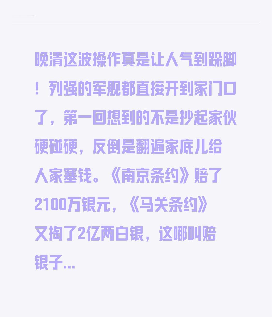 晚清这波操作真是让人气到跺脚!列强的军舰都直接开到家门口了,第一回想到的不是抄起家伙硬碰硬,反倒是翻遍家底儿给人家塞钱。《南京条约》赔了2100万银元,《马关条约》又掏了2亿两白银,这哪叫赔银子啊?分明是给抢东西的发过年红包! 当年要是能像俄罗斯那样强硬点,也不至于被欺负得连骨头渣子都快没了。现在想想都憋屈:老百姓饿着肚子啃树皮,白花花的银子却全填了列强的口袋。他们得了好处就更来劲,把咱们国家当成提款机,要多少给多少,一点不含糊。 看看现在某些国家,还在那儿演老戏码。但这些血泪教训明摆着:弯着腰过日子,和平根本就沾不上边儿!当年要是有现在这本事,早把列强的军舰炸成渣渣了。 发展才是实在理儿!弱国根本没外交权,腰杆硬了说话才有底气。要是能穿越回那个时候,你会咋做才能把这局面给扳回来?历史冷知识