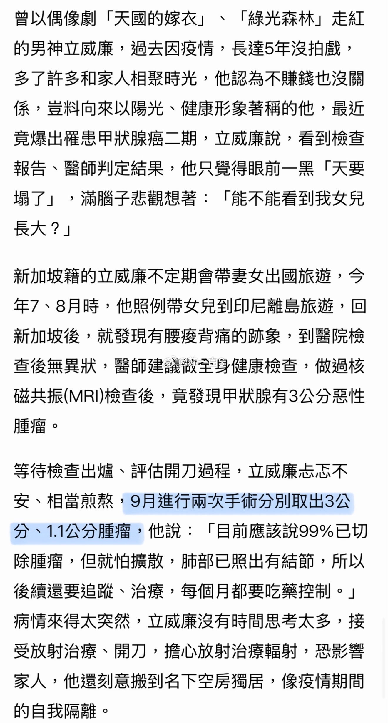 台媒报道说立威廉罹患甲状腺癌二期,已经动过两次手术了👇