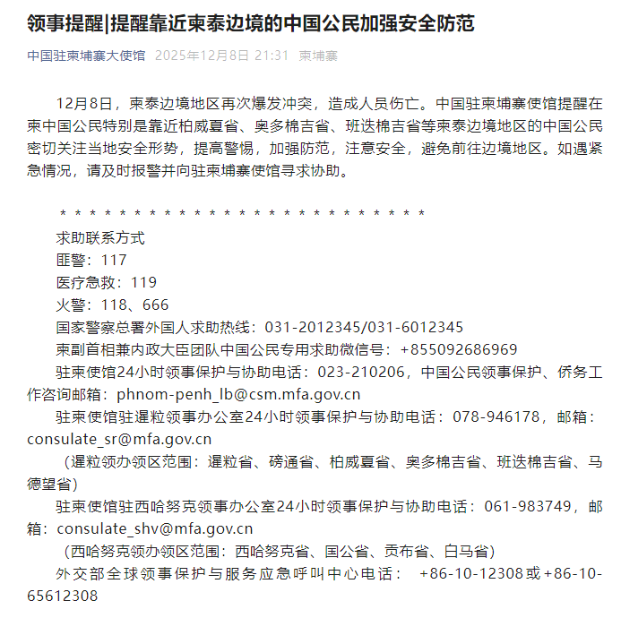12月8日,柬泰边境地区再次爆发冲突,造成人员伤亡。中国驻柬埔寨使馆提醒在柬中国公民特别是靠近柏威夏省、奥多棉吉省、班迭棉吉省等柬泰边境地区的中国公民密切关注当地安全形势,提高警惕,加强防范,注意安全,避免前往边境地区。如遇紧急情况,请及时报警并向驻柬埔寨使馆寻求协助。