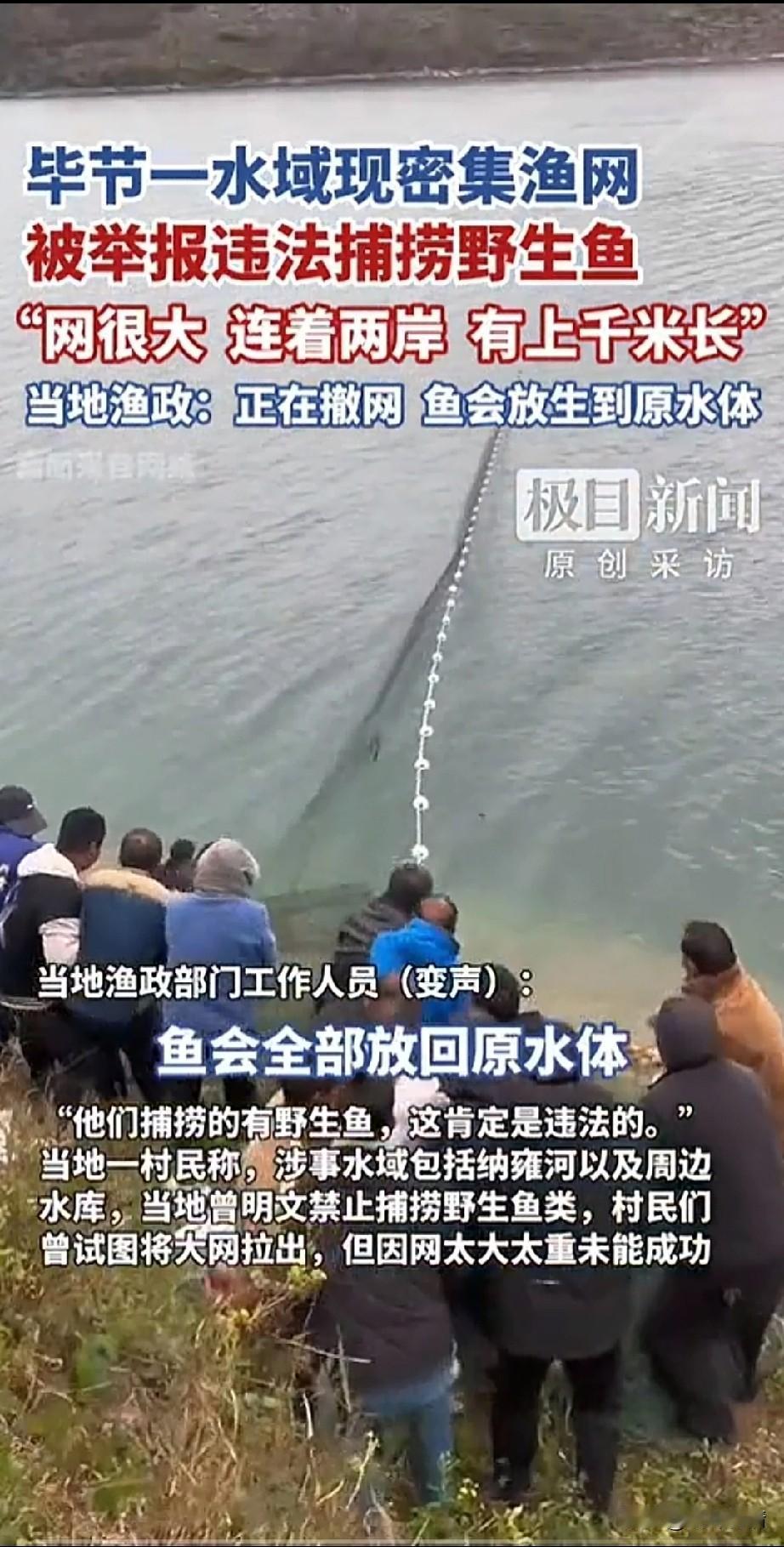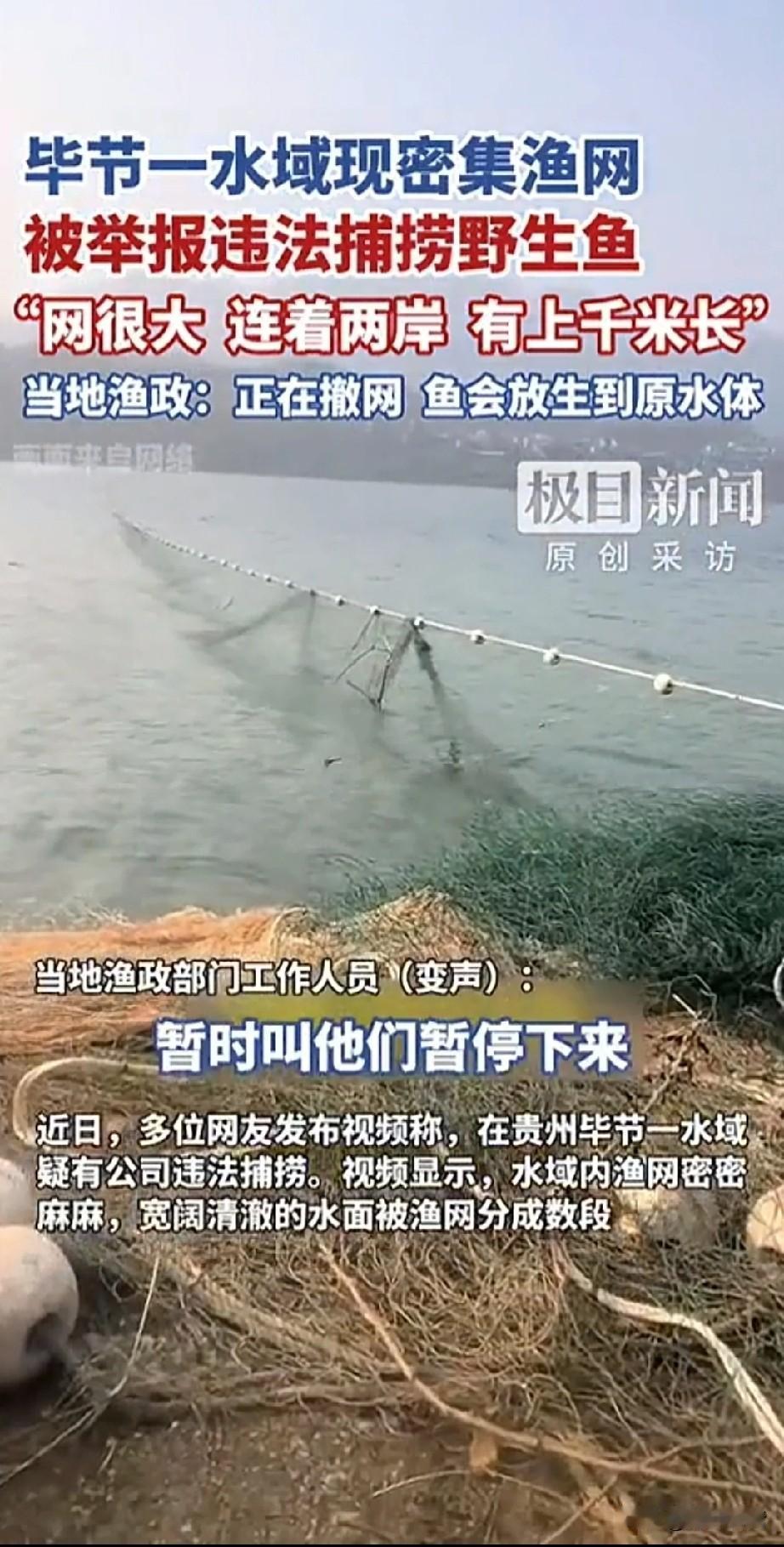 毕节一水域现密集渔网, 网很大连着两岸, 足足有上千米长, 应该是某公司捕捞, 当地村民表示, 该水域及附近水库明文禁止捕捞野生鱼类,他们捕捞的有野生鱼类, 肯定是违法的, 村民数人曾合力想要将渔网拉出, 但因为渔网太大太重,未能成功! 很多网友都发视频举报该水域疑似有公司违法捕捞,偌大的水面被巨型大网分成若干段,眼看事情闹大, 当地渔政部门不得不回应, 表示已经在撤网, 渔会放回原水体, 这年头就很奇怪了, 不管是湖边还是水库垂钓都被禁止, 说是为了保护鱼类的生存环境, 那这样用巨大渔网, 将野生鱼类一网打尽这又怎么解释? 相比之下垂钓危害就是最小的, 就算公司手续齐全, 捕捞野生鱼类也是违法的! 大家对于贵州毕节水域非法捕捞野生鱼类怎么看? 贵州身边事 非法捕捞问题探讨 河渔网 渔船渔网