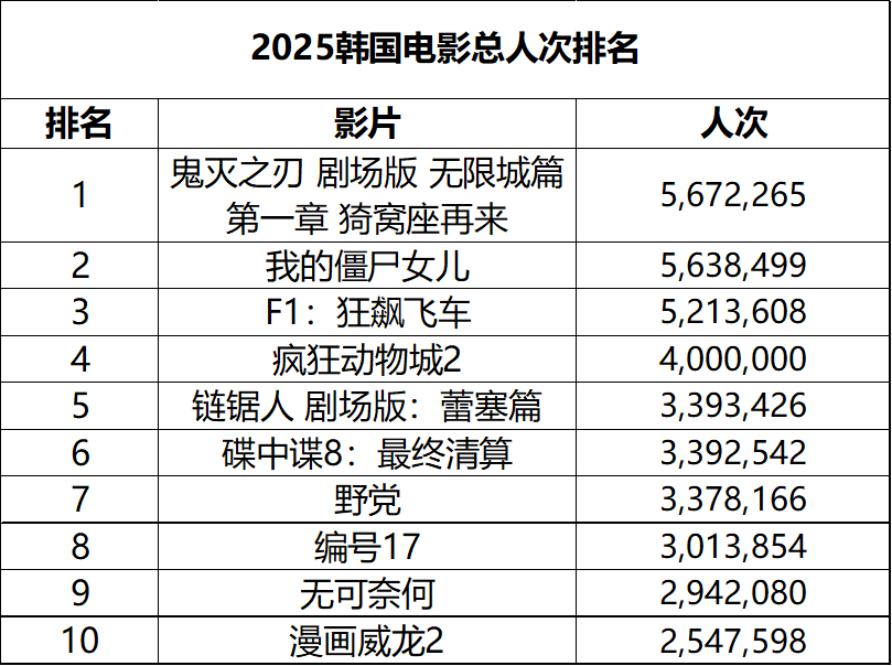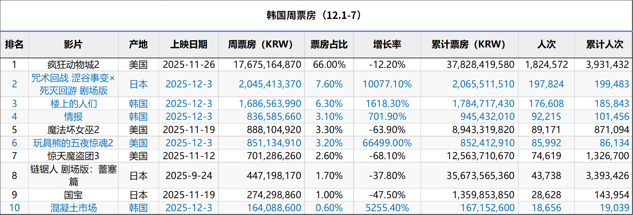 2025年第49周韩国票房 1.《疯狂动物城2》蝉联冠军,最新观影人次破400万排名年度第4;2.《咒术回战 涩谷事变×死灭回游 剧场版》在新片中成绩最佳;3.《链锯人 剧场版:蕾塞篇》累计人次339万超越《碟中谍8》《野党》排名年度第5。(数据:韩国电影振兴委员会)