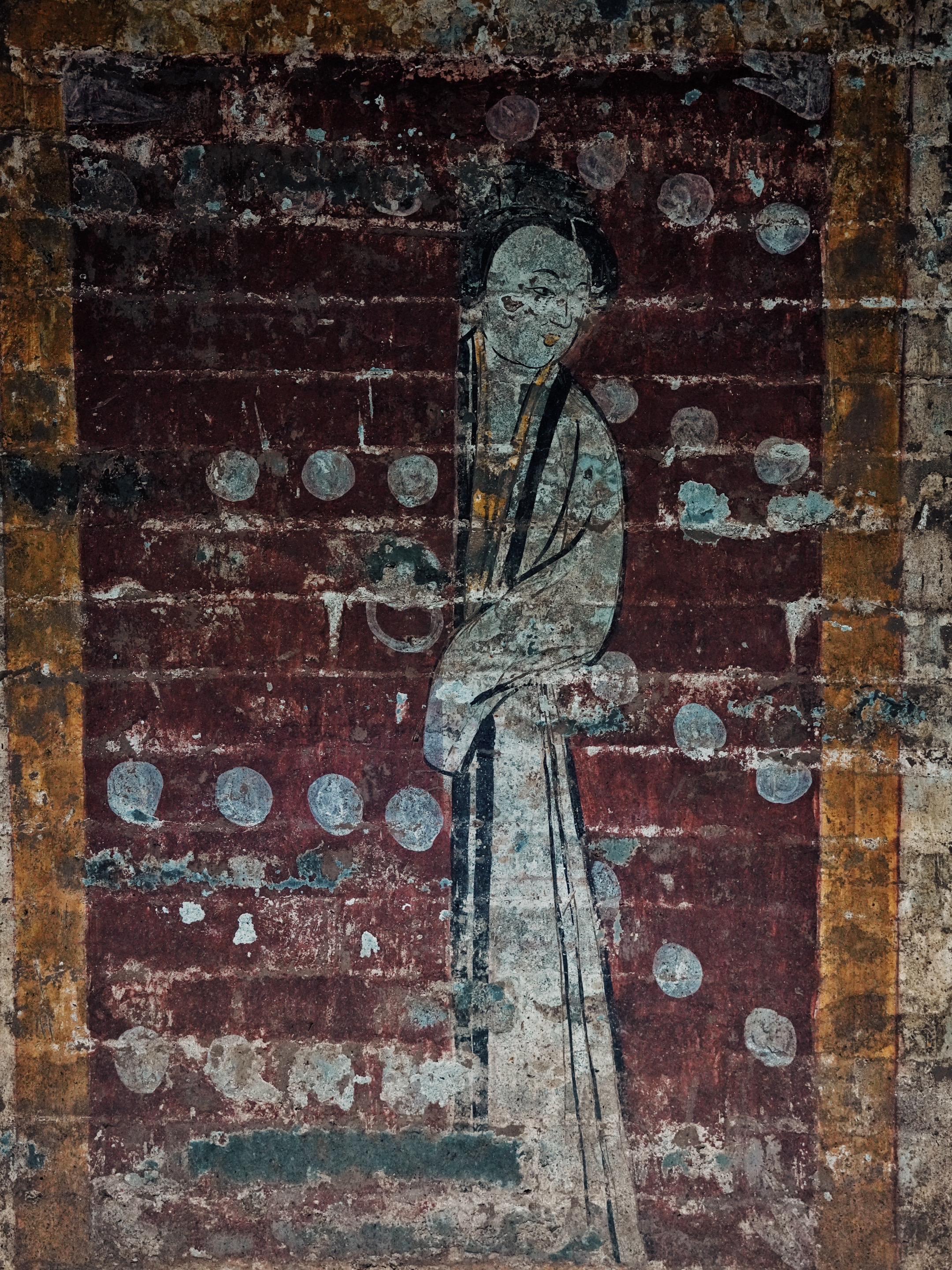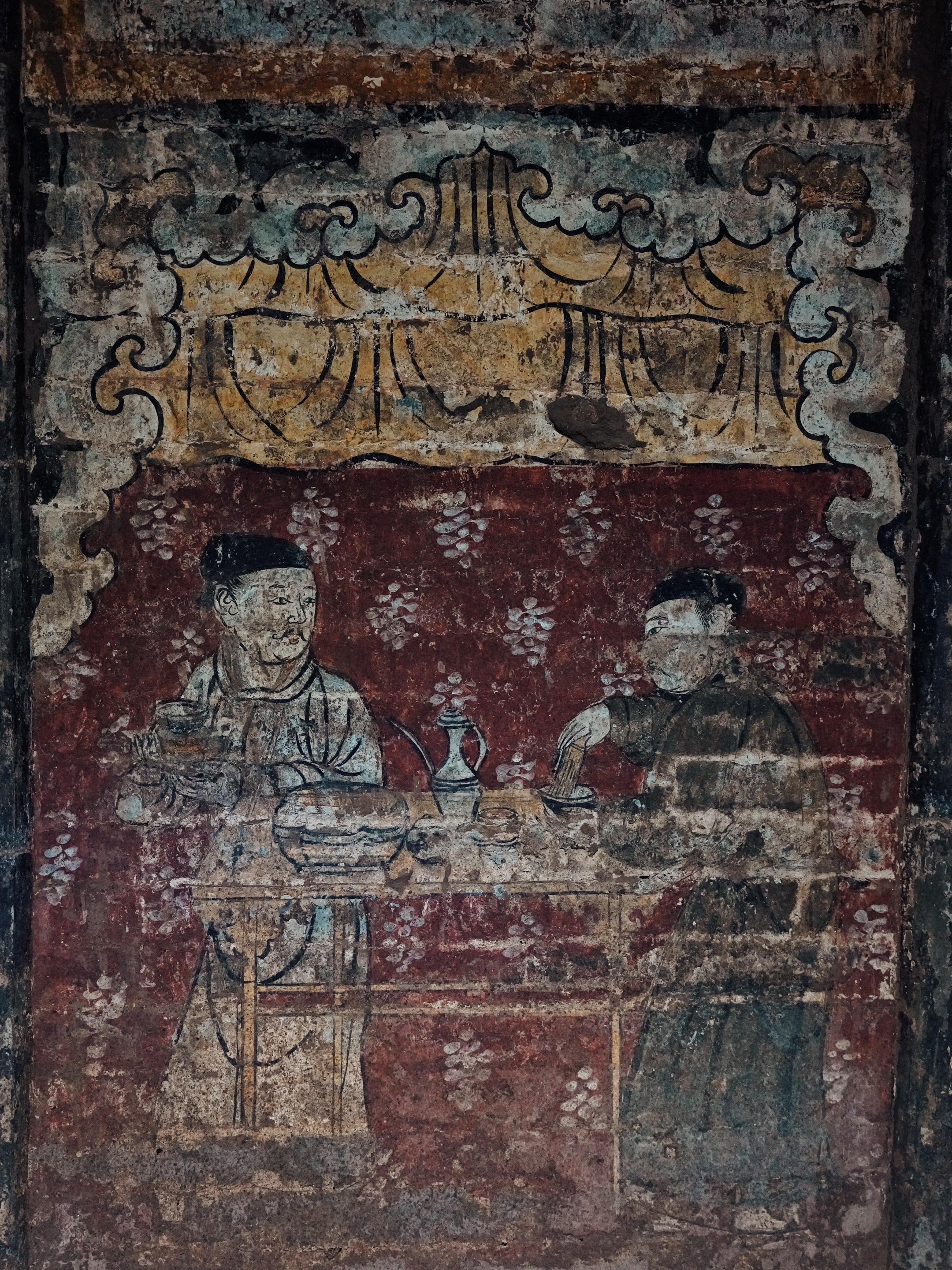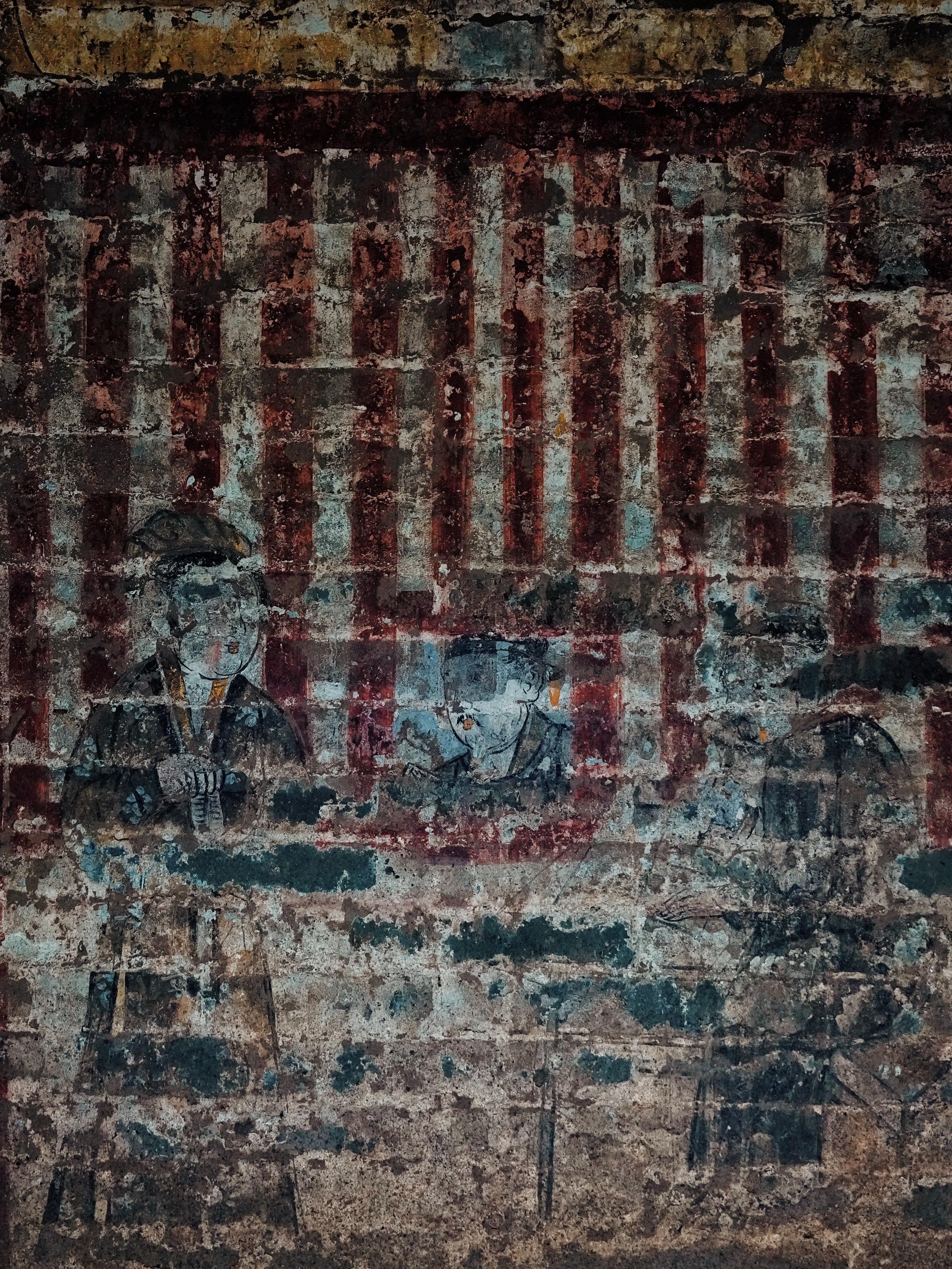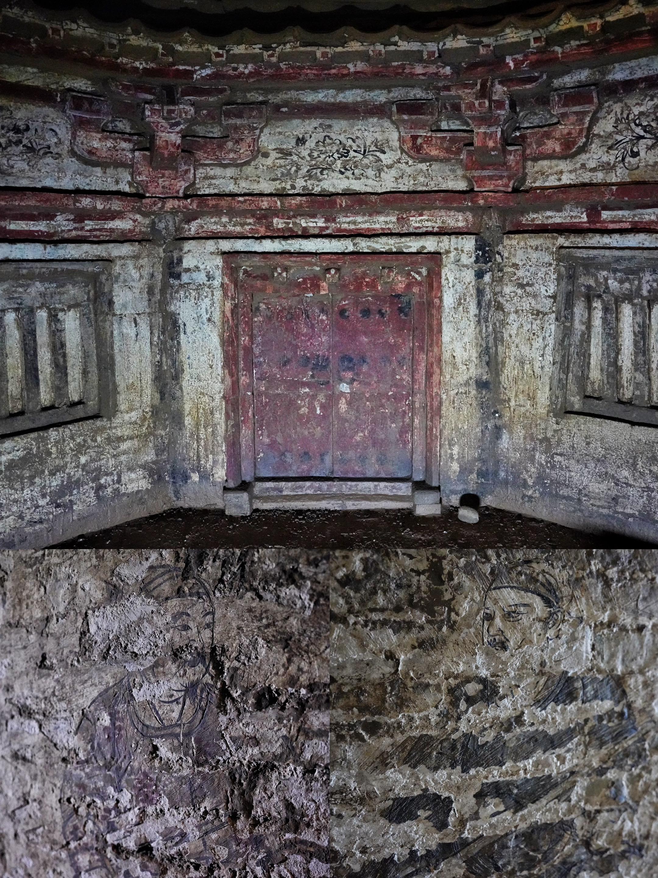 如果我下M2时和墓主人夫妇是“六目相对”的话,下M5打开手电,直接出现了5个人,刚开始我以为墓主人有5个老婆,后来仔细一看应该只有左右两个老婆,下面站着的或是侍女,或是二位夫人的子女?右下角还是个拿着苹果且嘟着嘴的秃头男性…