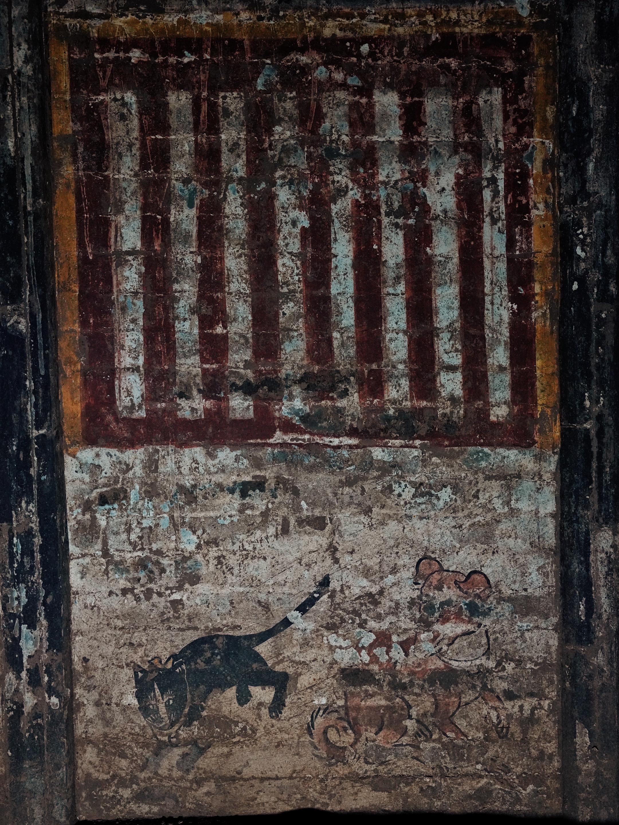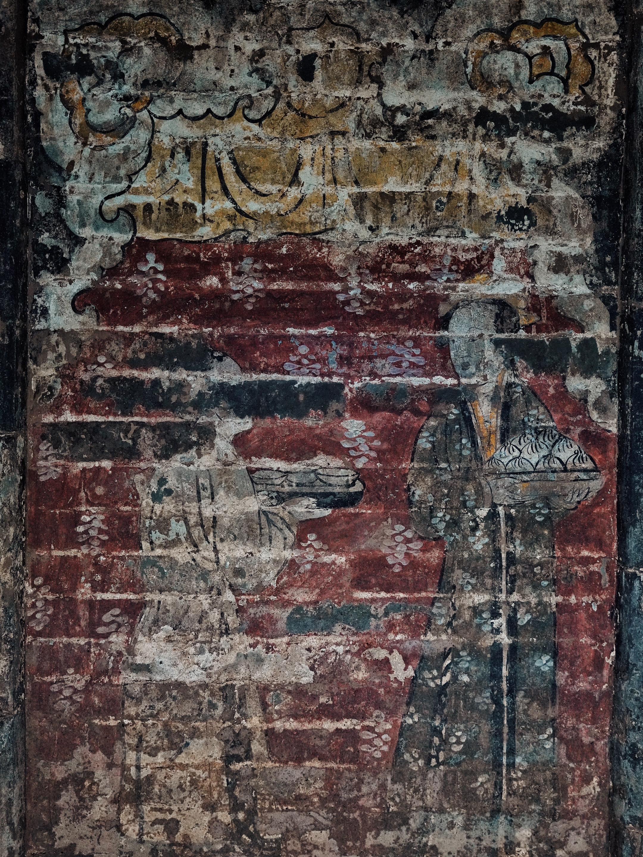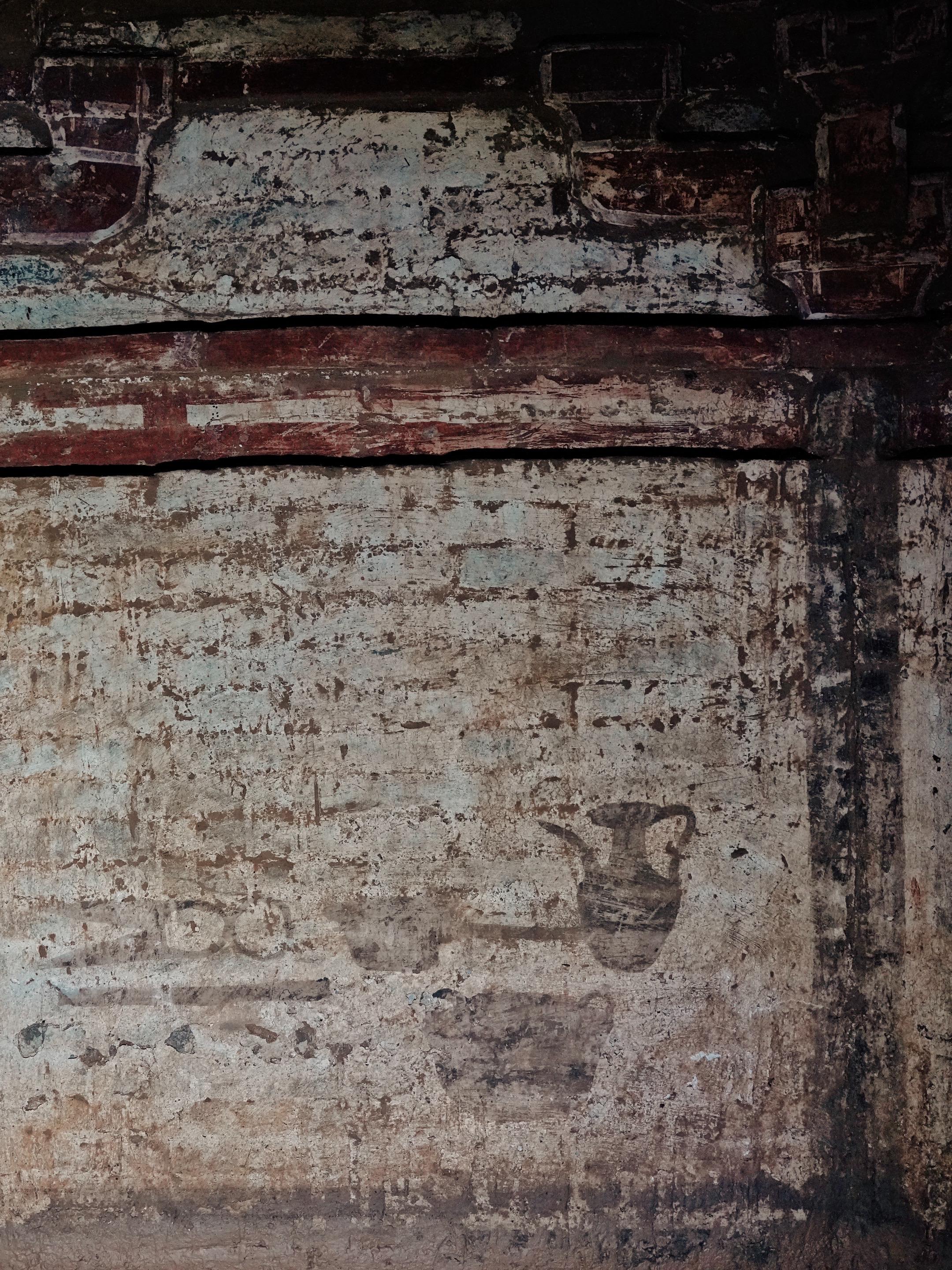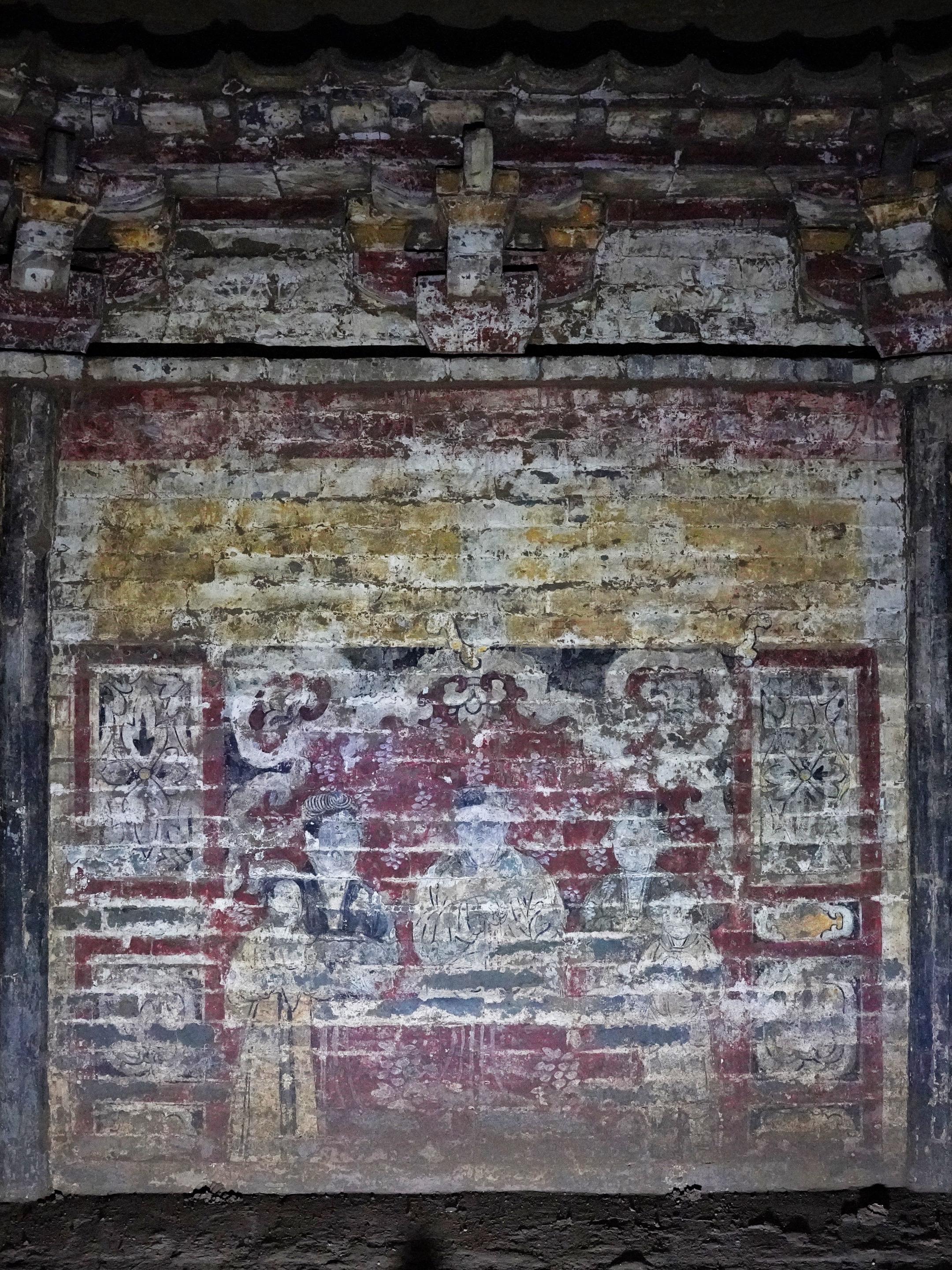 如果我下M2时和墓主人夫妇是“六目相对”的话,下M5打开手电,直接出现了5个人,刚开始我以为墓主人有5个老婆,后来仔细一看应该只有左右两个老婆,下面站着的或是侍女,或是二位夫人的子女?右下角还是个拿着苹果且嘟着嘴的秃头男性…