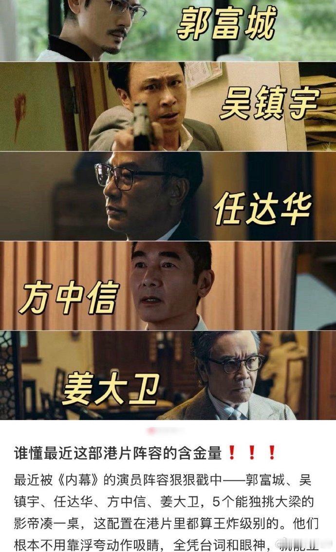 这样的叔圈天菜内幕有5个 《内幕》重新定义港片叔圈!郭富城一镜到底打戏流畅,吴镇宇痞子探长心细如发,任达华开场血书抓眼球,方中信伪善反派超带感,姜大卫眼神镇场,超300岁演技绝了!