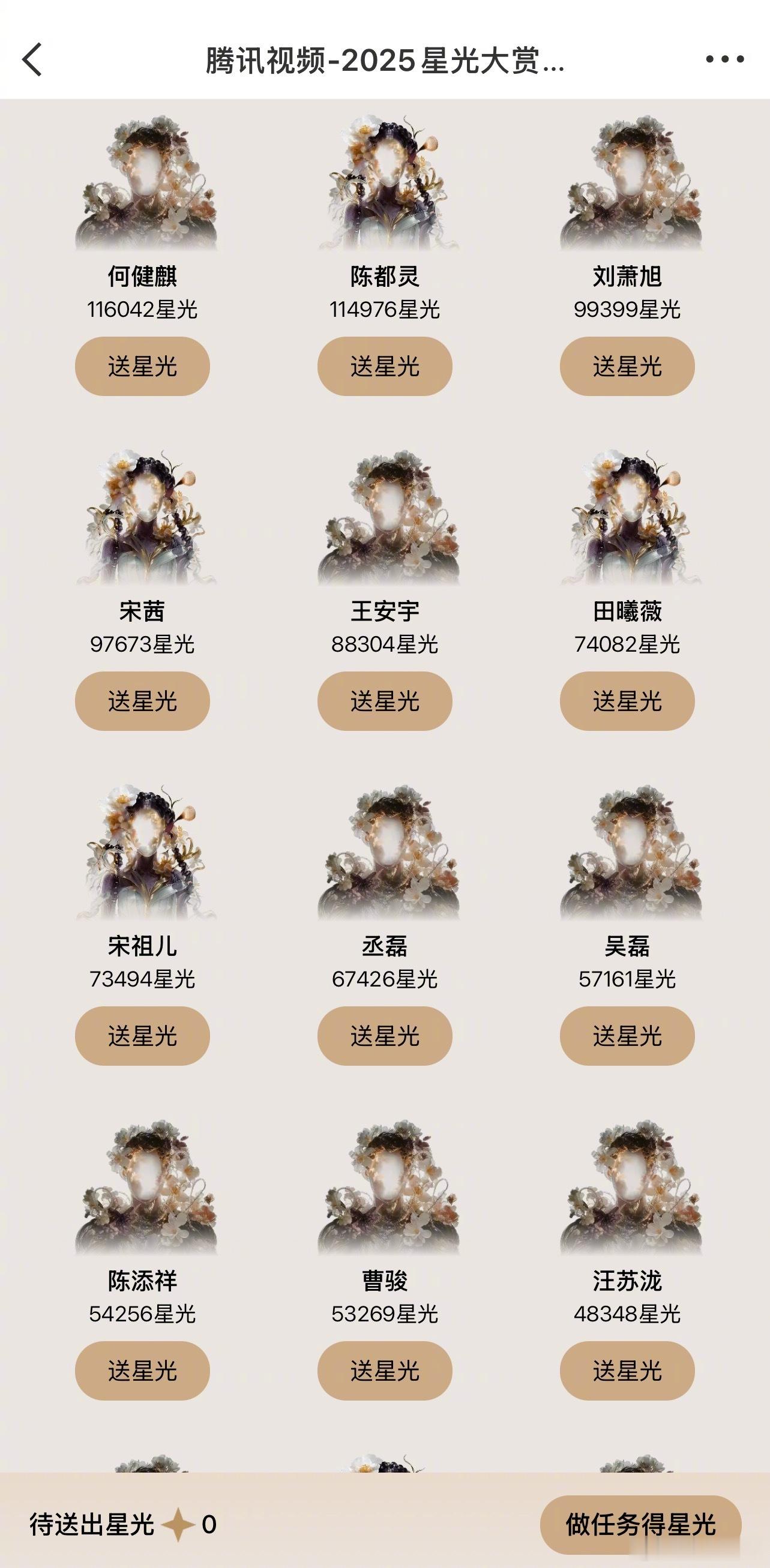 这个星光墙算不算挺能体现真实流量的?目前战况前十:时代少年团、刘宇宁、丁禹兮、赵露思、鞠婧祎、龚俊、孟子义、白鹿、檀健次、李昀锐星光大赏投票腾讯视频星光大赏