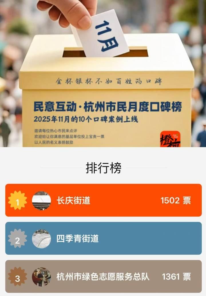 截至昨晚10点,榜单已吸引数千市民关注,已投出了1.1万票。目前,拱墅区长庆街道因高效解决林司后小区车棚反光、车辆乱停等民生诉求,获市民认可,暂列榜首。上城区四季青街道紧随其后,针对钱江新城迪凯银座下沉广场的安全隐患,街道迅速清除不合理停车位、加贴警戒线,获当事人“这就是杭州速度”的称赞。杭州市绿色志愿服务总队发起的“一把伞,一座城”闲置雨伞循环公益行动,通过增设站点、引入专业维修力量,让旧伞焕发新生,其环保与温情并存的理念获得大量支持,位列前三。