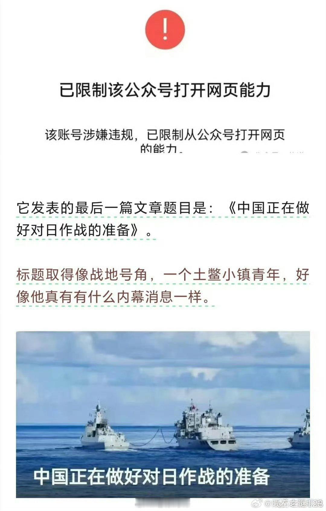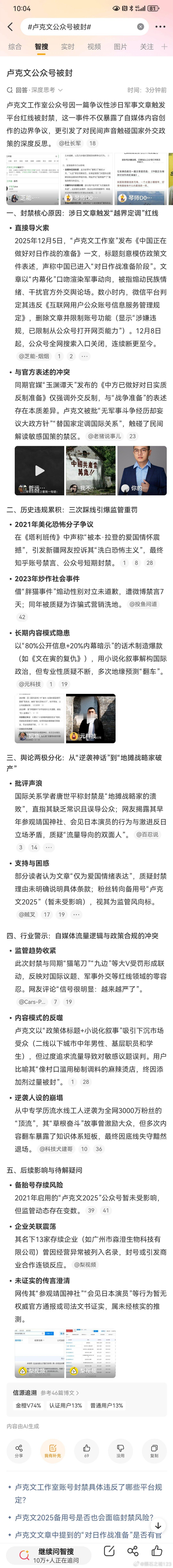 卢克文公众号被封某些大V,粉丝稍微多一点,阅读量稍微大一点,收入稍微高一点,就飘起来了。忘记了自己的身份。在战争这样事关全局,事关每个国人安危的重大议题上,都敢妄加猜测,甚至做出安排。让不明真相的吃瓜群众,还以为他有什么背景,知道点啥内幕消息似的。