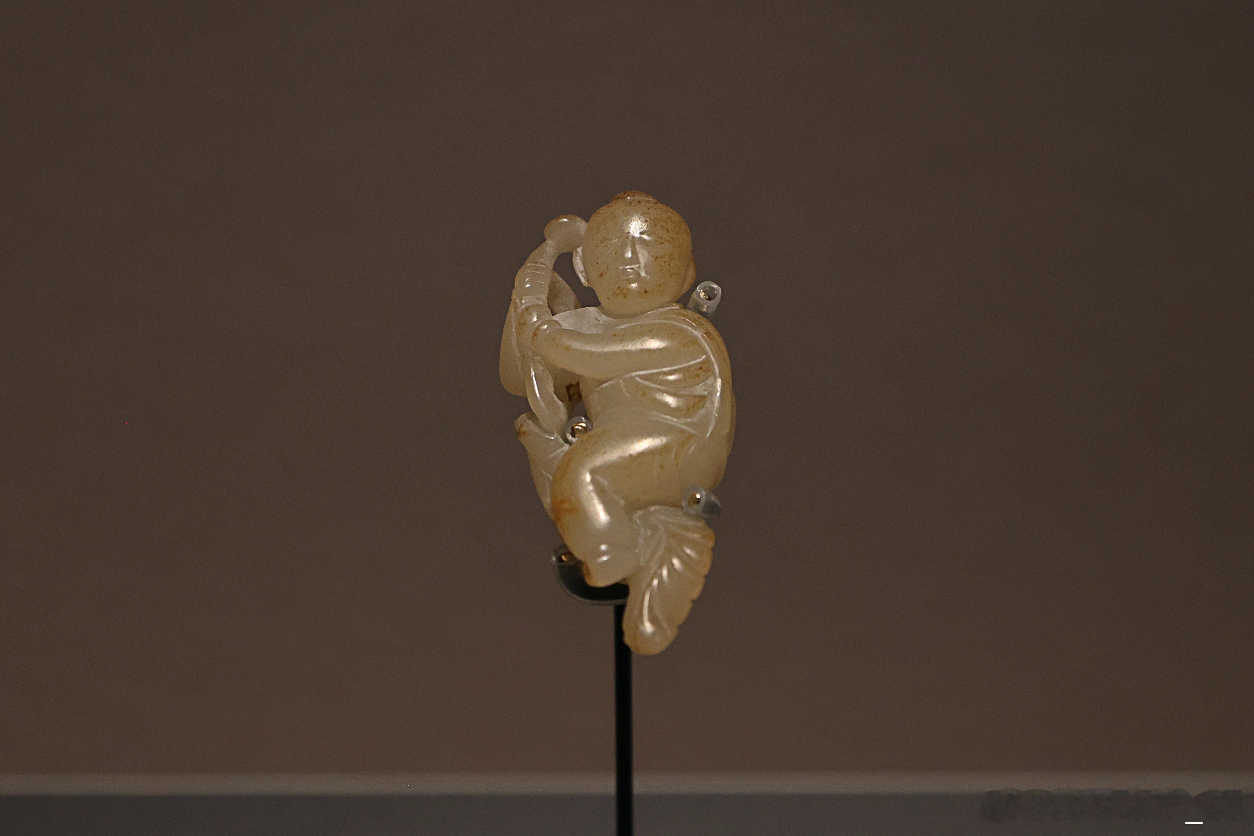 白玉童子坠宋 (公元960-1279年)故宫博物院藏1956年由康泰初捐献故宫。和田玉子料雕琢,有大片黄色沁斑。童子左手戴手镯,下穿肥大的裤子,双手攀枝叶,两足紧踩树叶作骑坐树叶状,造型生动,形态活波可爱。