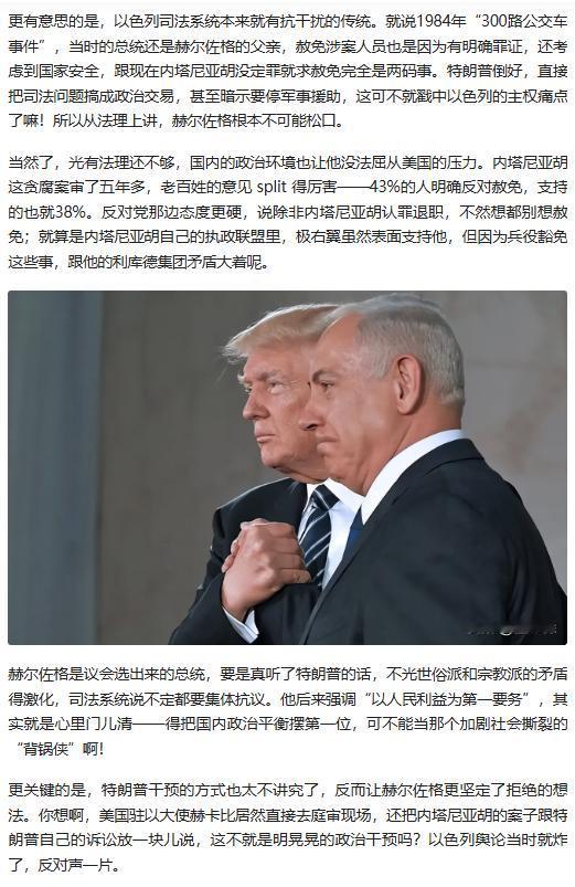 特朗普想赦免内塔尼亚胡?以色列总统直接说不,主权面前没商量! 原文来自:董希