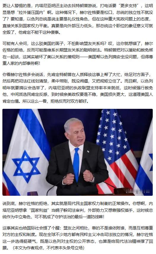 特朗普想赦免内塔尼亚胡?以色列总统直接说不,主权面前没商量! 原文来自:董希淼,《以色列总统为何敢硬刚特朗普?拒赦内塔尼亚胡的底气藏在哪?》
