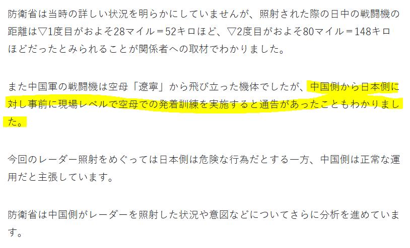 直到12月9号上午,关于最近的雷达照射事件,中国与日本仍然陷入某种叙述上的“罗生门”。中国强调,我们已经提前通报了辽宁号编队训练的情况;而日本则强调中方没有通报,在9号上午的国会质询当中,防卫大臣小泉进次郎再次强调“中方没有通报”。然而很快,事情就变得更为清楚了,日本NHK的报道直接揭穿了小泉和高市这两天的谎言。 日本NHK今天中午的这个报道,是基于对日本防卫省官员的采访所写成的。重点提到了两个新的事实性的证据: 第1个证据是,它补充了中方进行雷达照射的现场情况,第1次进行照射时,中日双方军机的距离是52公里;而第2次进行照射时,中日双方军机的距离是148公里。 第2个也是更为决定性的证据是,根据日本防卫省官员的论述,“中方的确在事前对日本方面进行通告,宣布将在航空母舰上进行起降训练。”这也就是图片当中我标黄的部分。 因此,现在的事实就很清楚了,中方陈述的是事情的真相,那就是中方进行远海训练,并且已经提前向日本进行通报。而日本反复强调的“中方没有通报”,则是彻彻底底的谎言。日方是刻意采取一些挑衅性的举动,并且把脏水泼在中国的身上,意图制造不利于中方的国际舆论,把中方塑造成一个咄咄逼人的形象。 其实这一切的逻辑,和当时二战时期日本发动战争的思维是完全一致的,卢沟桥的事件还殷鉴不远,这更彰显出日本当前的战略思维,尤其是第一线军官的思维没有发生根本的变化。 而既然事实已经清楚了,日本自卫队故意挑衅的行动,势必会再次冲击高市内阁,下一阶段必须要有人出面负起这个责任。当然这个人肯定不会是高市早苗,极有可能会冲击到防卫大臣小泉进次郎。有意思的是,这一次防卫省内部公开事实“打脸”小泉,一定程度上也反映出他们对这一位夸夸其谈的公子哥空降防卫省的不屑和不满。