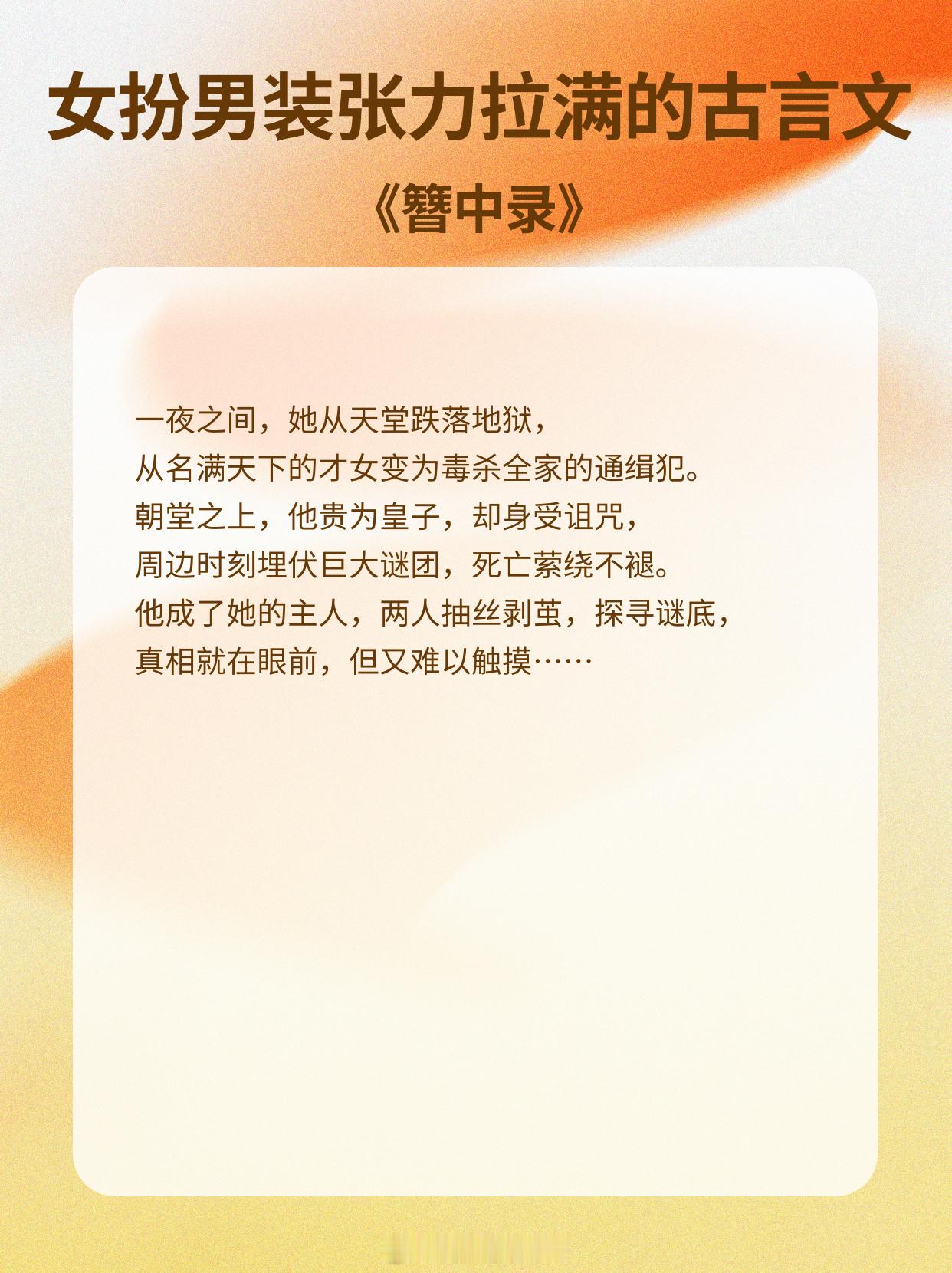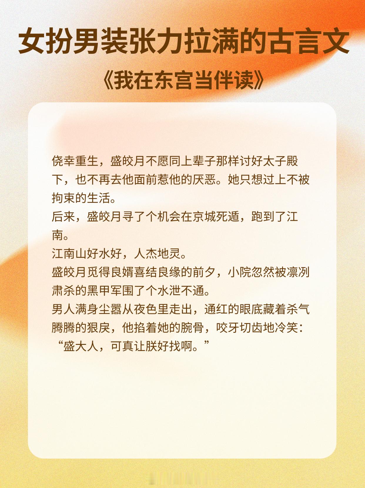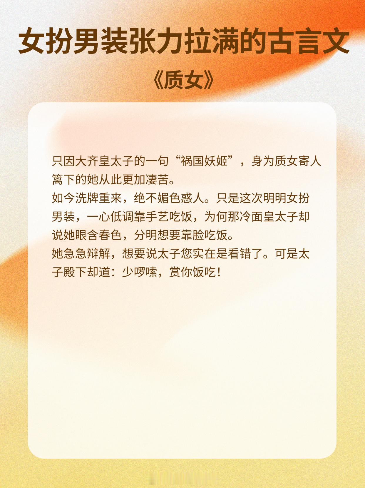 女扮男装张力拉满的古言文,从勾心斗角到求而不得。1、《探花》作者:卿隐2、《簪中录》作者:侧侧轻寒3、《贵极人臣》作者:姽婳娘4、《人间灶(美食)》作者:三水小草5、《质女》作者:狂上加狂6、《我在东宫当伴读》作者:的卢7、《恰逢雨连天》作者:沉筱之8、《力荐河山》作者:退戈9、《四夷译字传奇》作者:小狐濡尾让我吹爆的宝藏小说 这小说硬控我十分钟