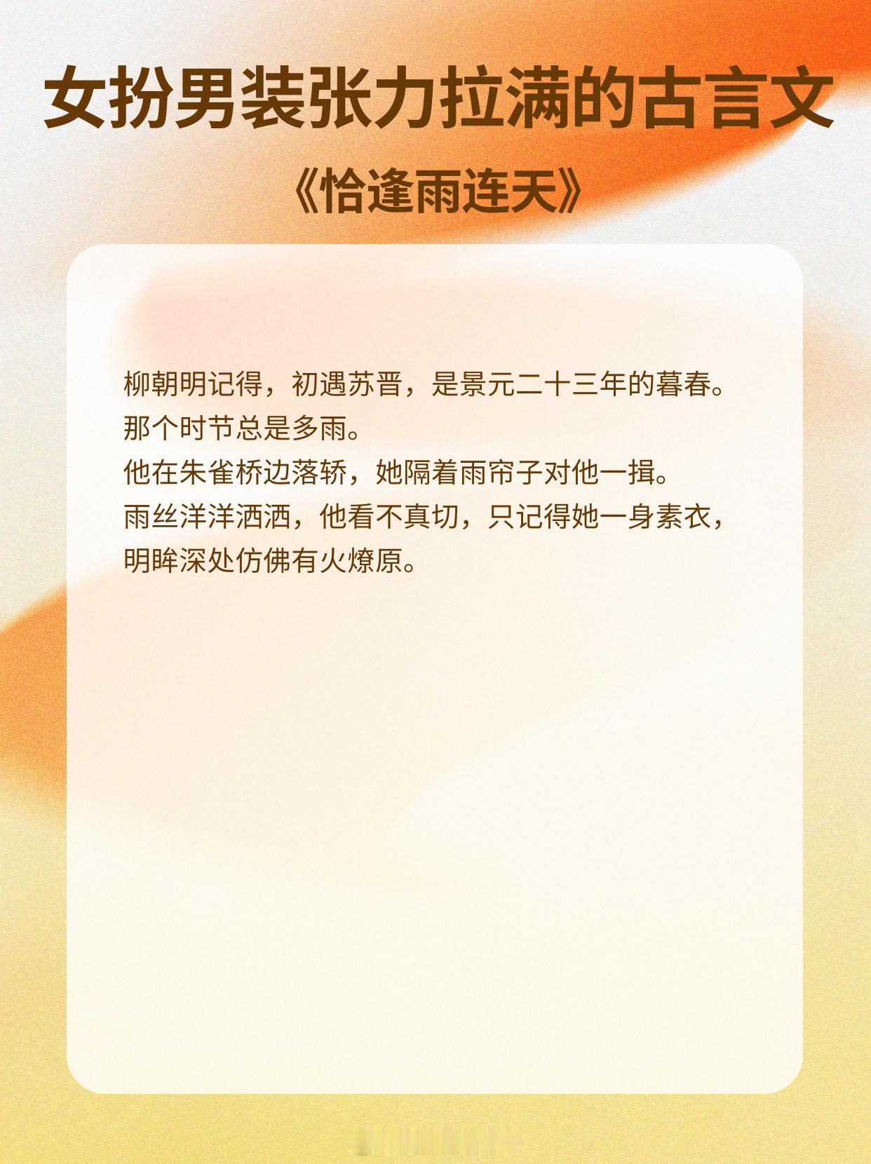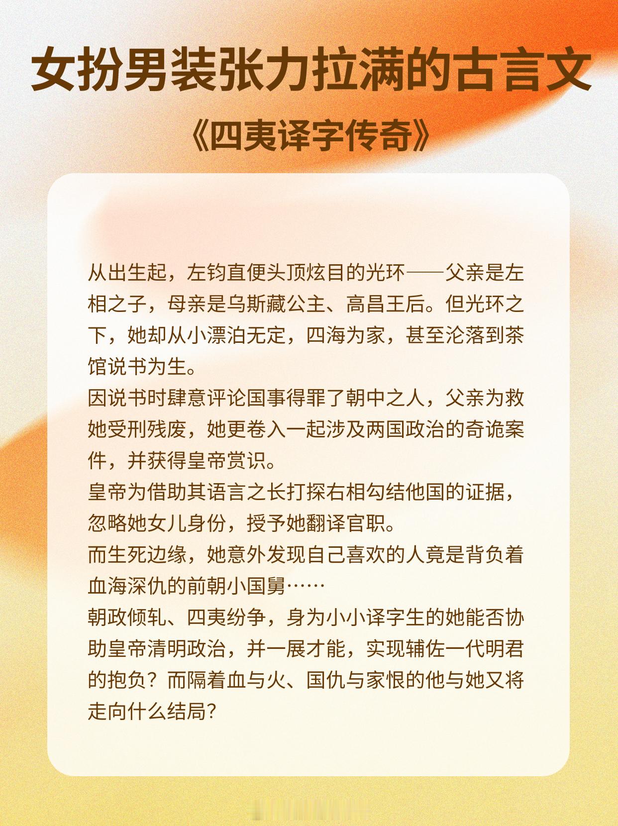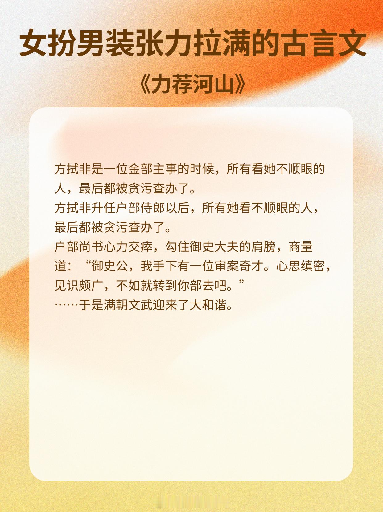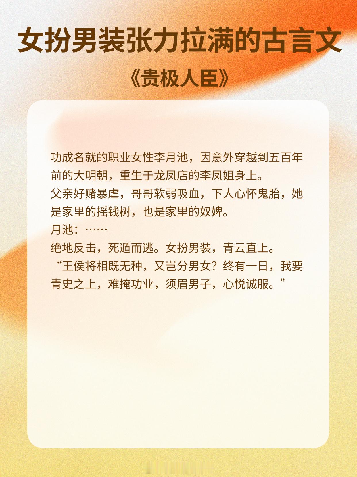 女扮男装张力拉满的古言文,从勾心斗角到求而不得。1、《探花》作者:卿隐2、《簪中录》作者:侧侧轻寒3、《贵极人臣》作者:姽婳娘4、《人间灶(美食)》作者:三水小草5、《质女》作者:狂上加狂6、《我在东宫当伴读》作者:的卢7、《恰逢雨连天》作者:沉筱之8、《力荐河山》作者:退戈9、《四夷译字传奇》作者:小狐濡尾让我吹爆的宝藏小说 这小说硬控我十分钟