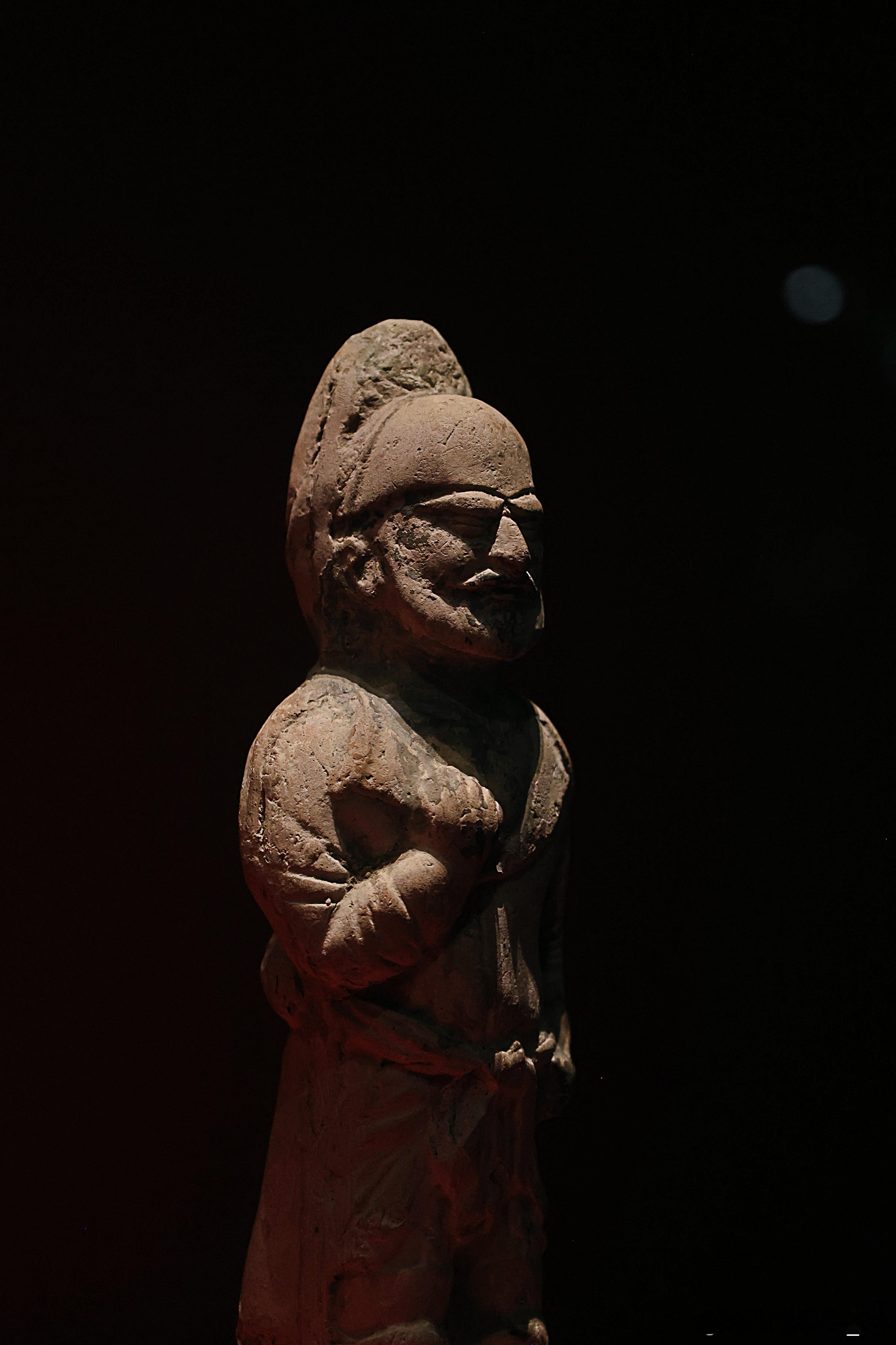 中华文明的有力见证-北京通史陈列 红陶男立俑 唐 (公元618-907年)首都博物馆藏北京西城陶然亭出土。“幽州胡马客,绿眼虎皮冠”,李白的诗句,真实记录了当时幽州地区胡人往来的景象。