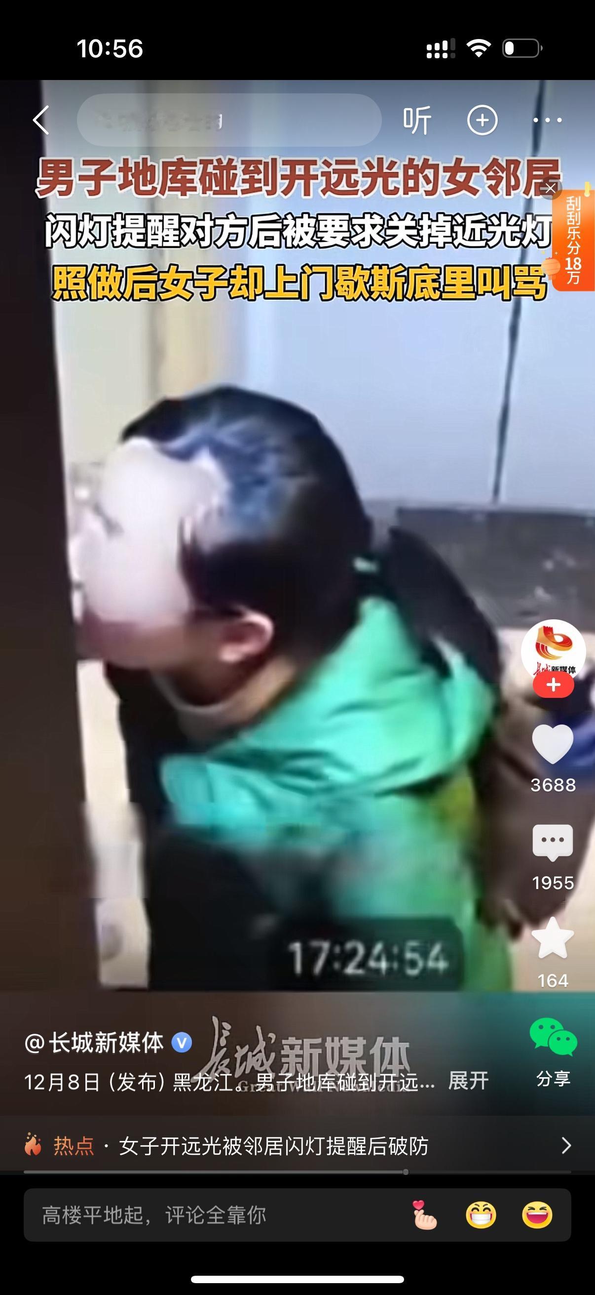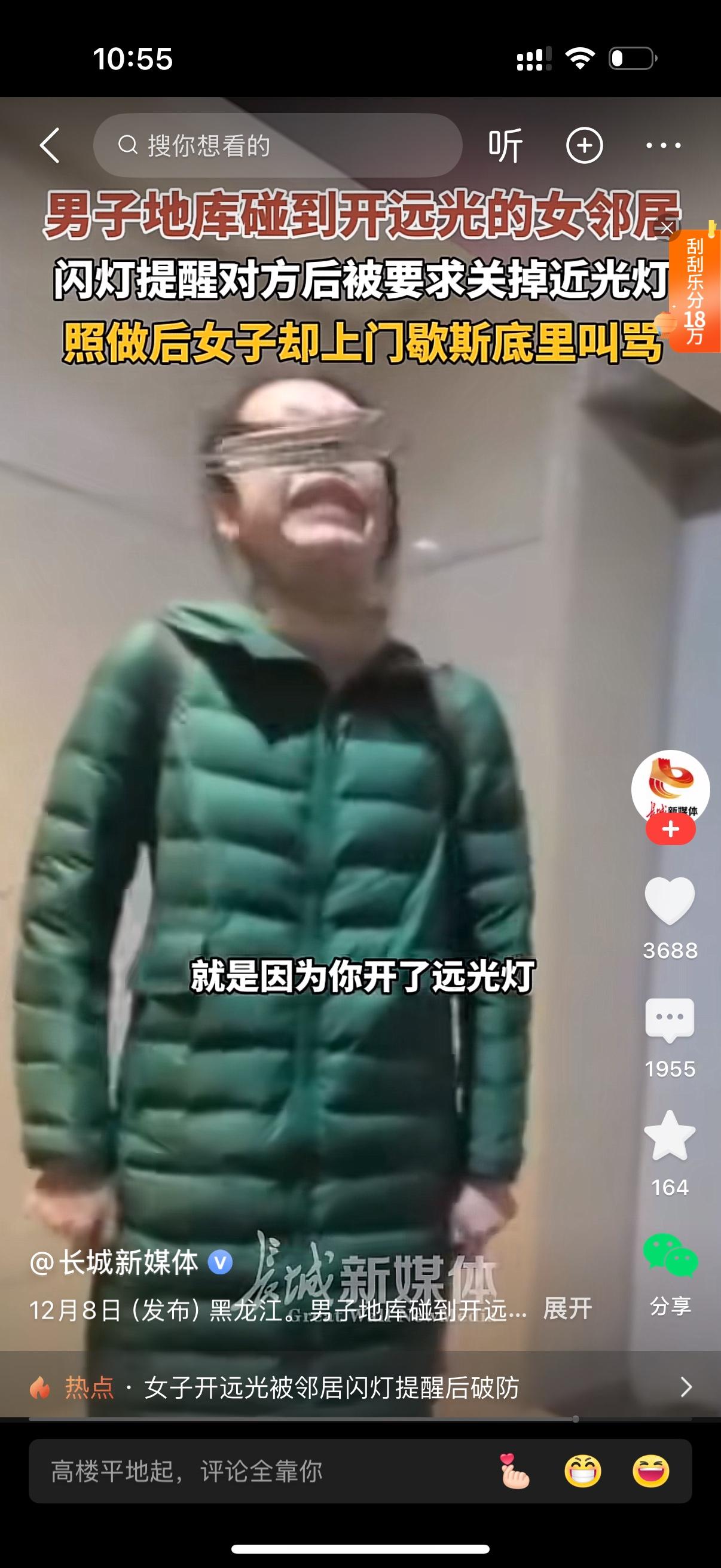 男子地库碰到开远光的女邻居。男子闪灯提醒女子后,女邻居要求男子关掉近光灯。男子无奈关掉,车前一片漆黑。本以为这事就过去了。没想到这个女邻居居然跑到男子家门口大喊大叫,说自己没有开远光灯。女子近乎歇斯底里的呐喊,让人非常不适。这样的邻居,真是让人可怕。