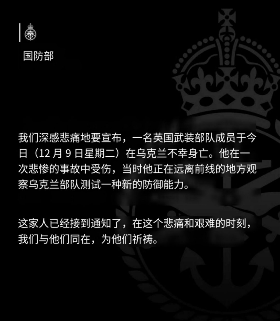 英国首次宣布英国军人在乌克兰身亡英国国防部发布声明称,当地时间12月9日,一名英