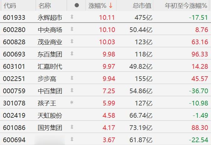 格隆汇12月10日|A股市场零售股上午盘中表现强势,截至半日收涨,永辉超市、中央商场、茂业商业、东百集团、汇嘉时代、步步高涨停,中百集团涨超7%,孩子王涨超5%。