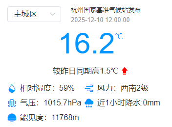 昨天杭州最高气温16.6℃,今天12时的实时气温为16.2℃,比昨日同期上升了1.5℃。