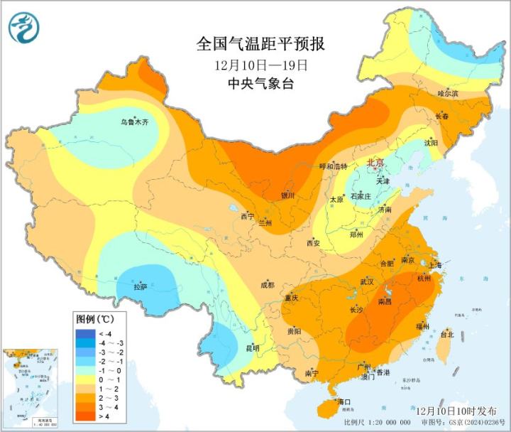 根据中央气象台给出的中期预报,12月10日-19日,全国大部地区平均气温较常年同期偏高,其中,新疆北部、内蒙古大部、甘肃北部、宁夏、东北地区中部和东部、黄淮、江淮、江南、华南大部及贵州东部等地平均气温较常年同期偏高2~4℃。